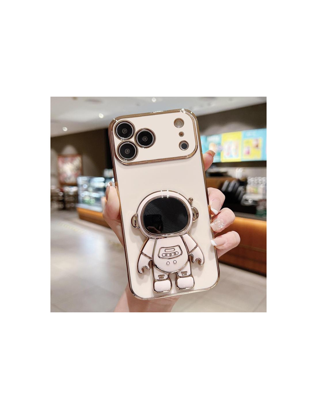 Cover iPhone 17 Pro Max in PC con design astronauta e anello metallico. Protezione elegante e funzionale.