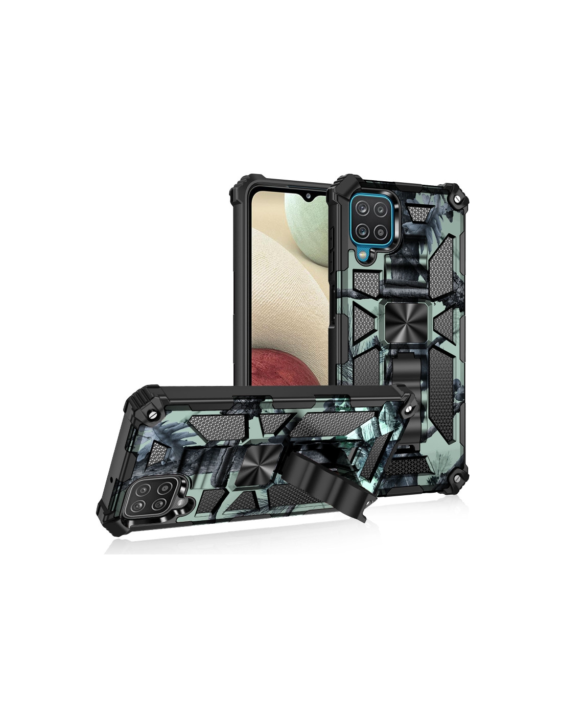 Cover antiurto Galaxy A12 in TPU + PC con design mimetico e supporto integrato. Protezione totale in colore menta.