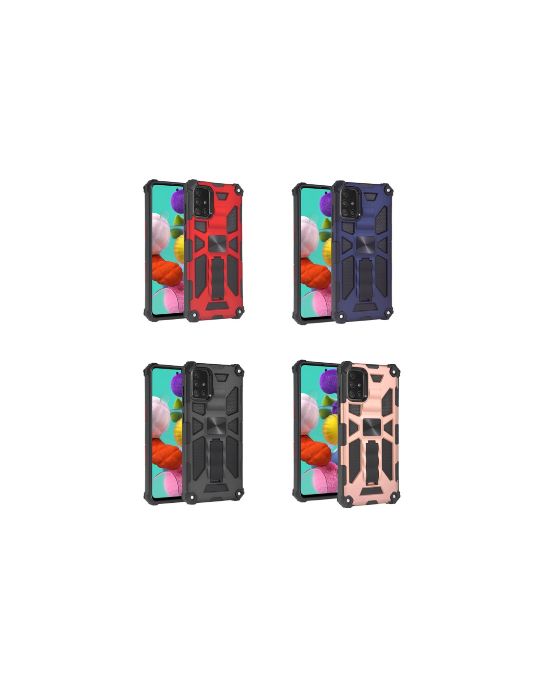 Cover antiurto per Galaxy A51 in TPU e PC con supporto integrato e magnete. Protezione totale con design blu.