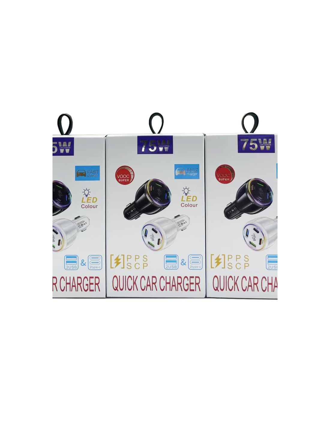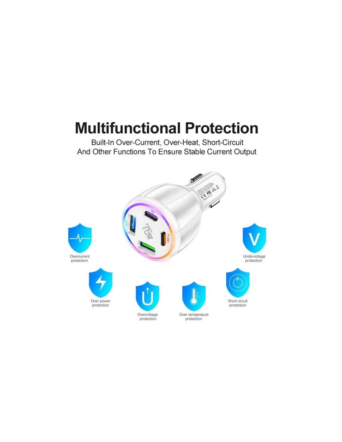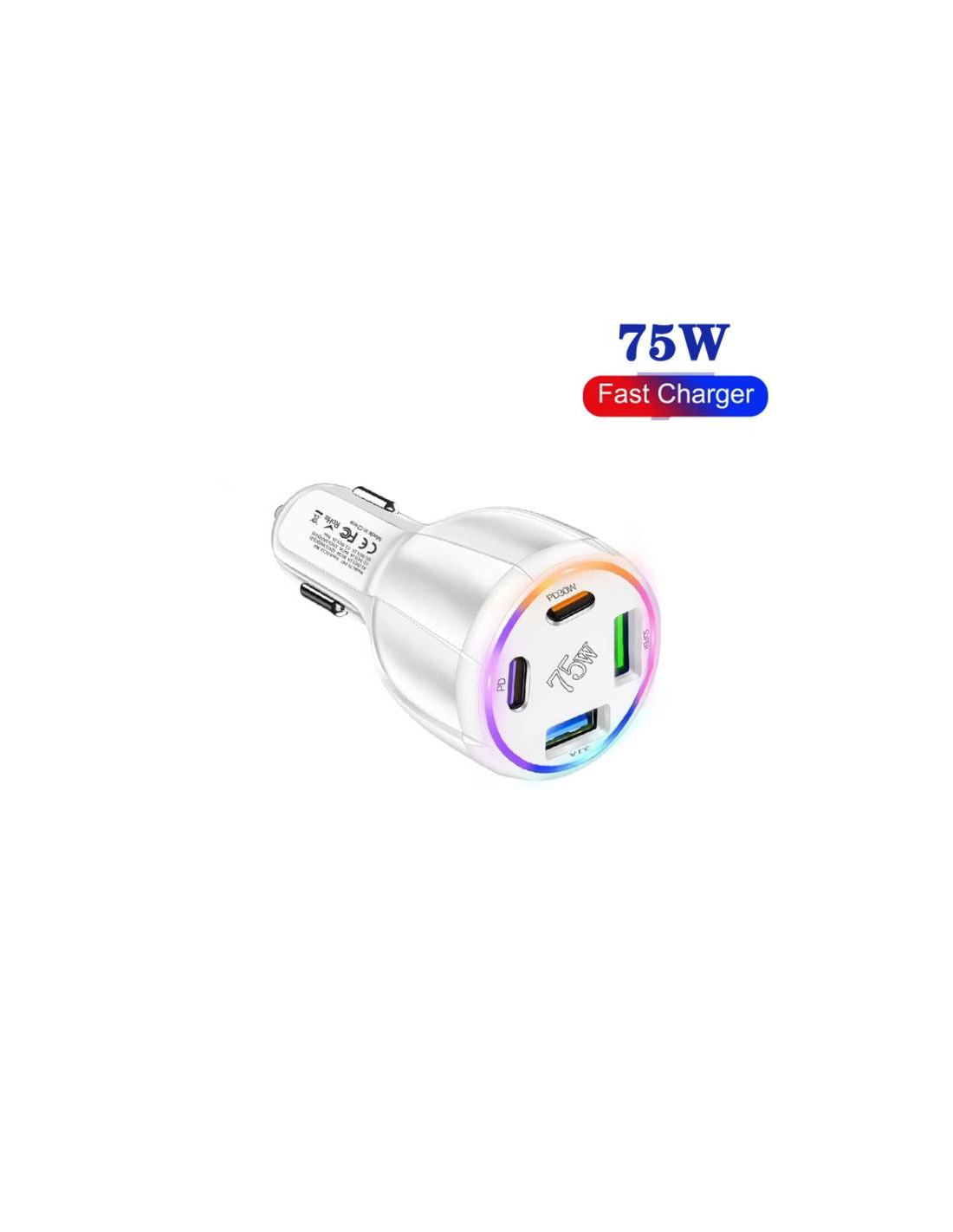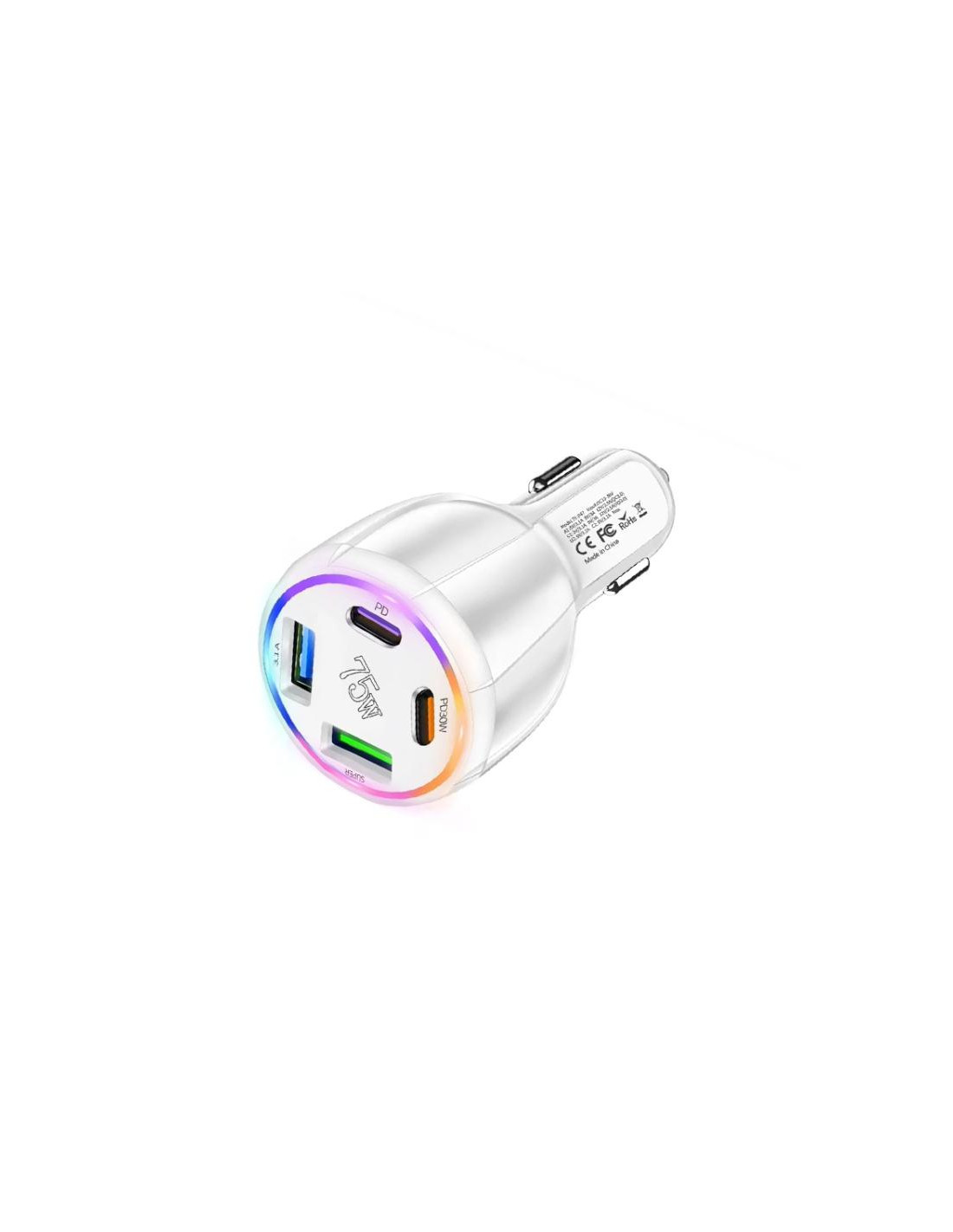 Caricabatterie auto multi-porta di alta qualità realizzato in plastica robusta, disponibile in elegante colore bianco. Perfetto per mantenere i tuoi dispositivi sempre carichi durante i viaggi in auto.