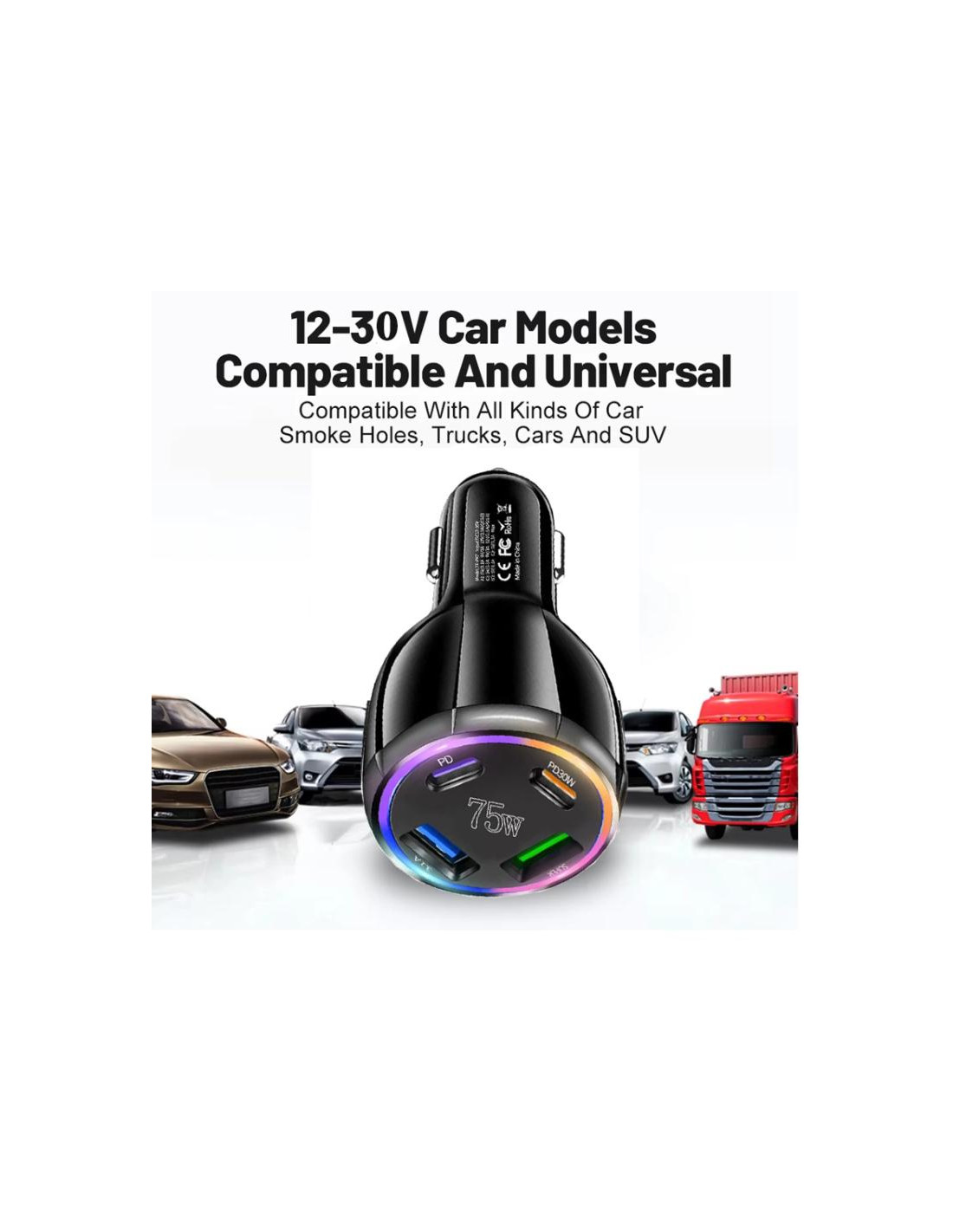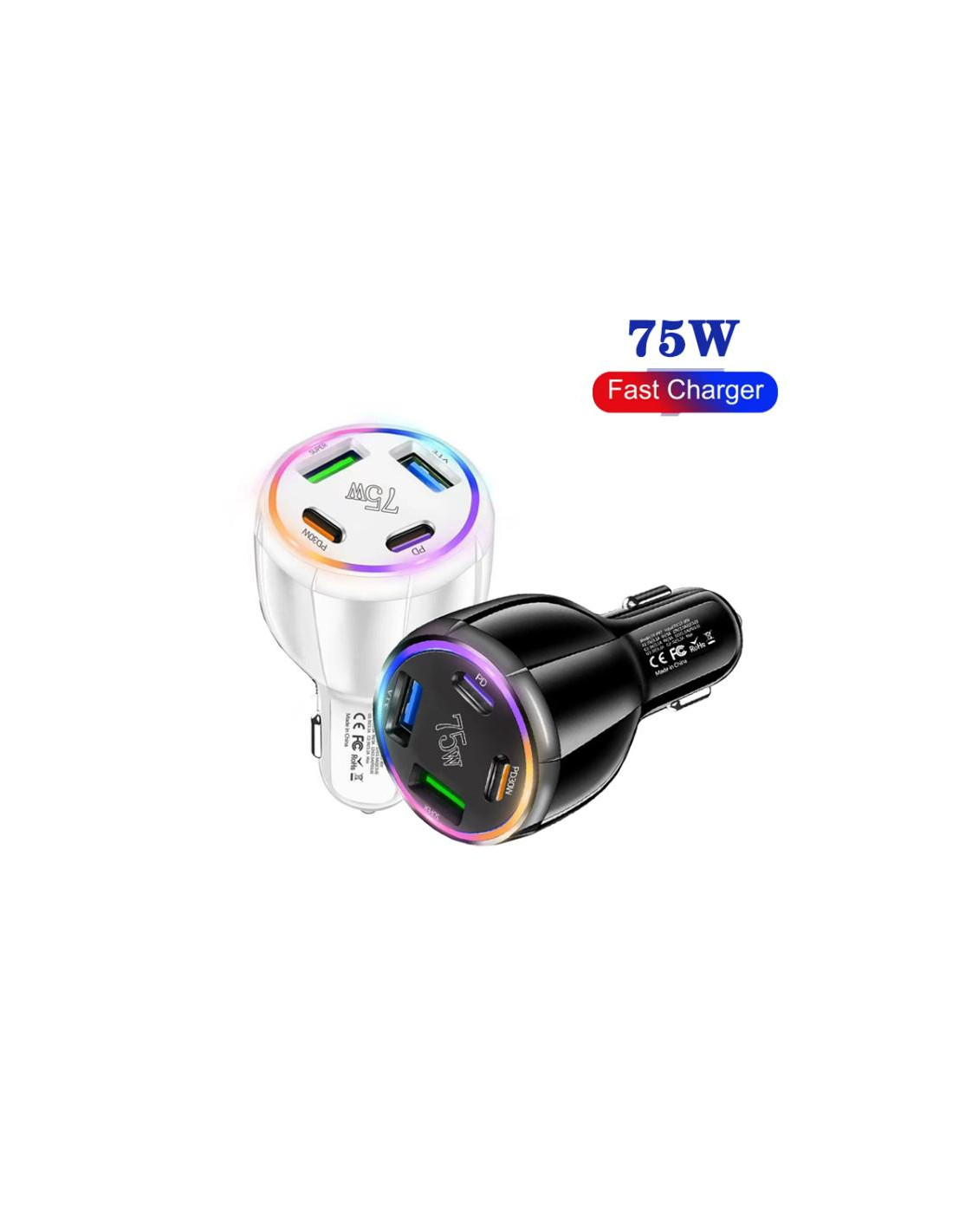 Caricabatterie auto 75W con 4 porte per ricaricare simultaneamente fino a 4 dispositivi. Connettori USB-C e USB.