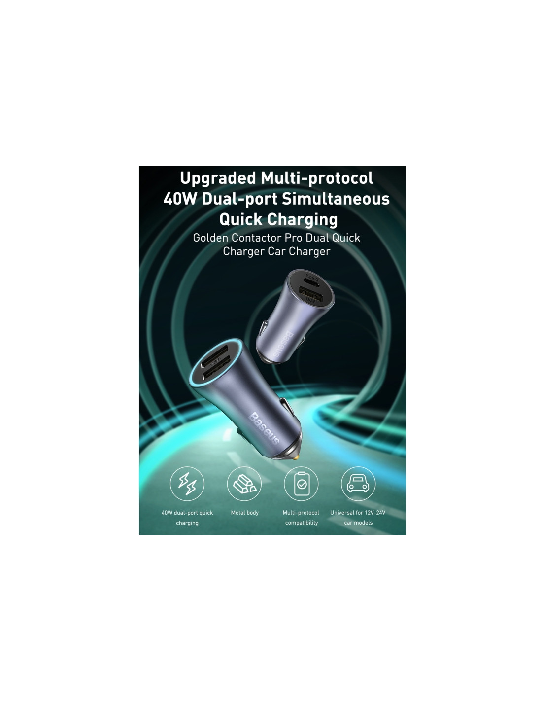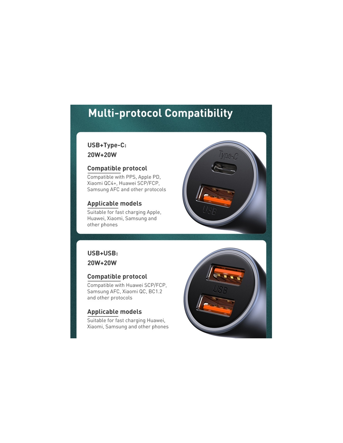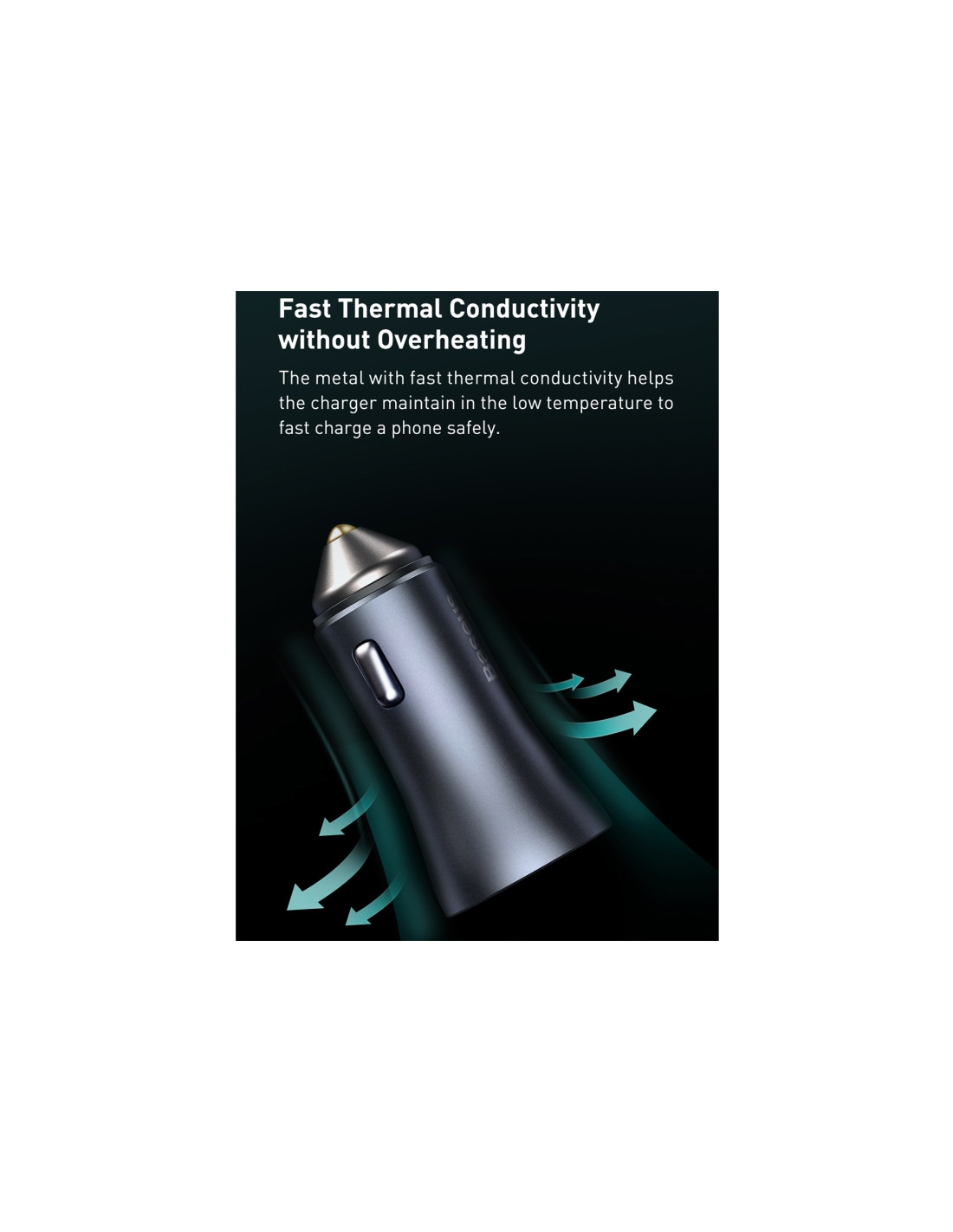 Caricabatterie auto Baseus con connettori USB e Type-C per ricarica rapida. Design grigio scuro, compatibile con tutti gli smartphone.