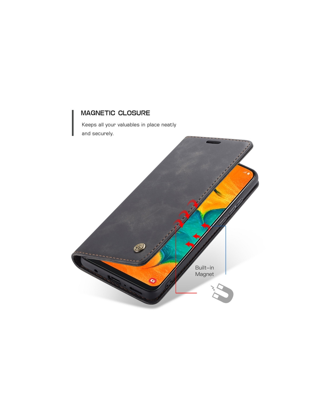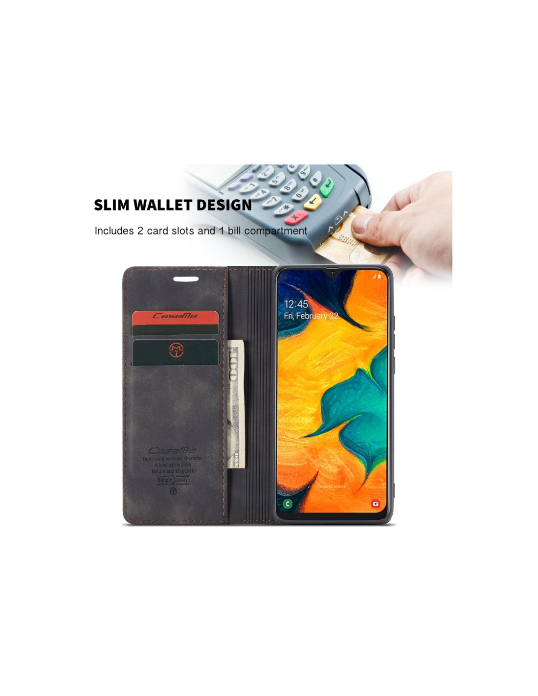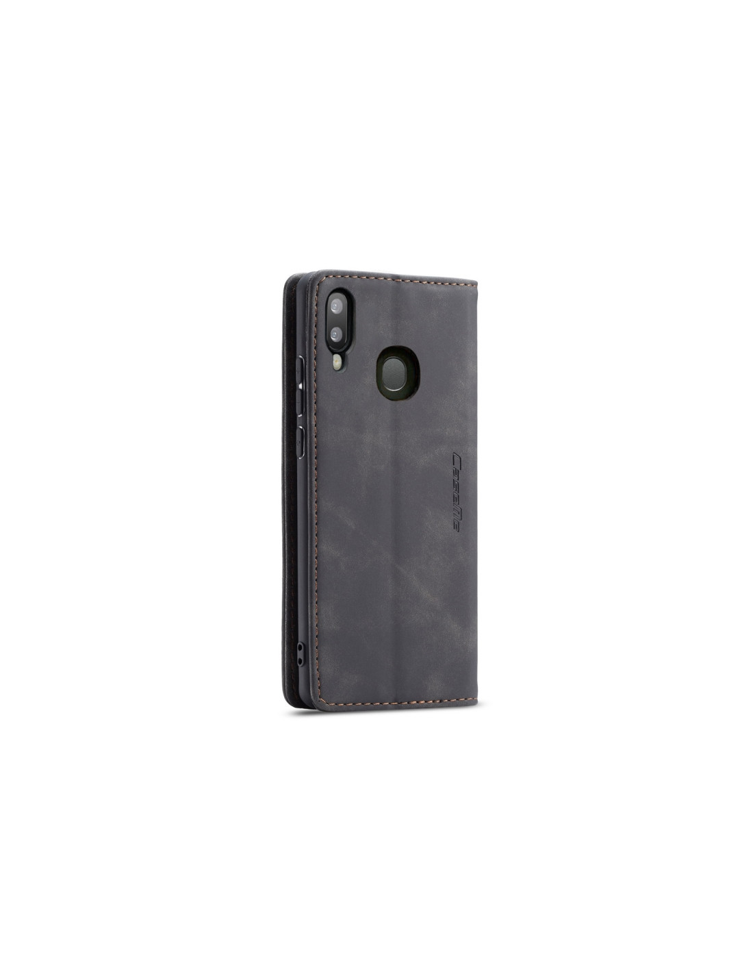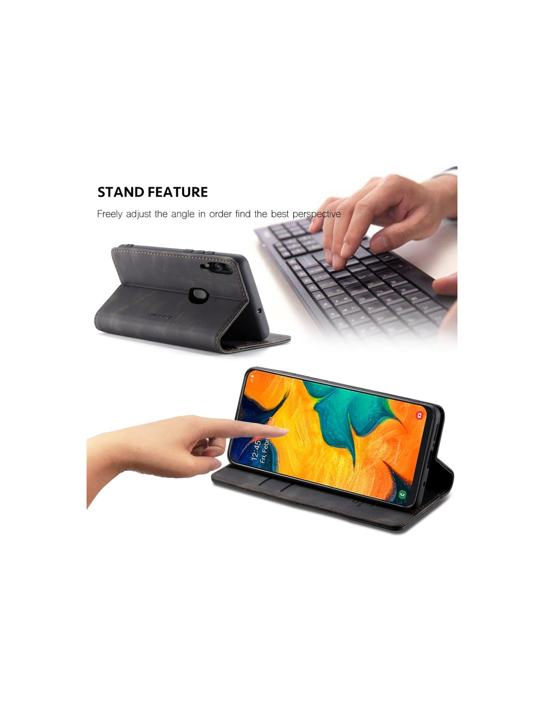 Cover a libro in pelle per Galaxy A40 con scomparti per carte e supporto integrato. Design retrò elegante.