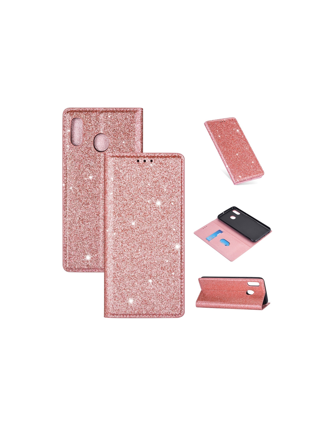 Cover a libro Galaxy A20e in pelle PU glitterata con chiusura magnetica, porta carte e supporto integrato.