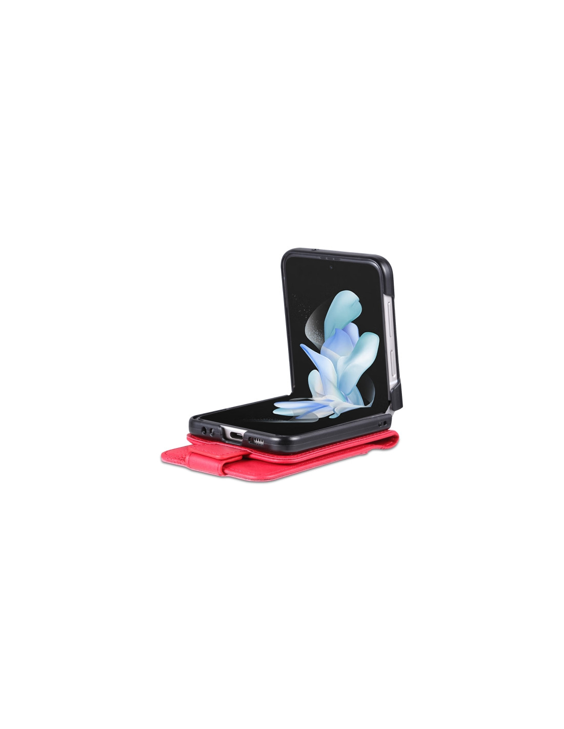 Cover a libro Galaxy Z Flip5 in pelle con texture vitello e chiusura magnetica. Protezione elegante e funzionale.