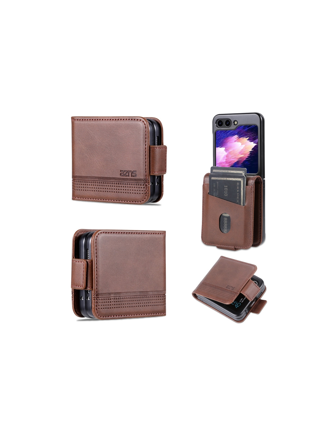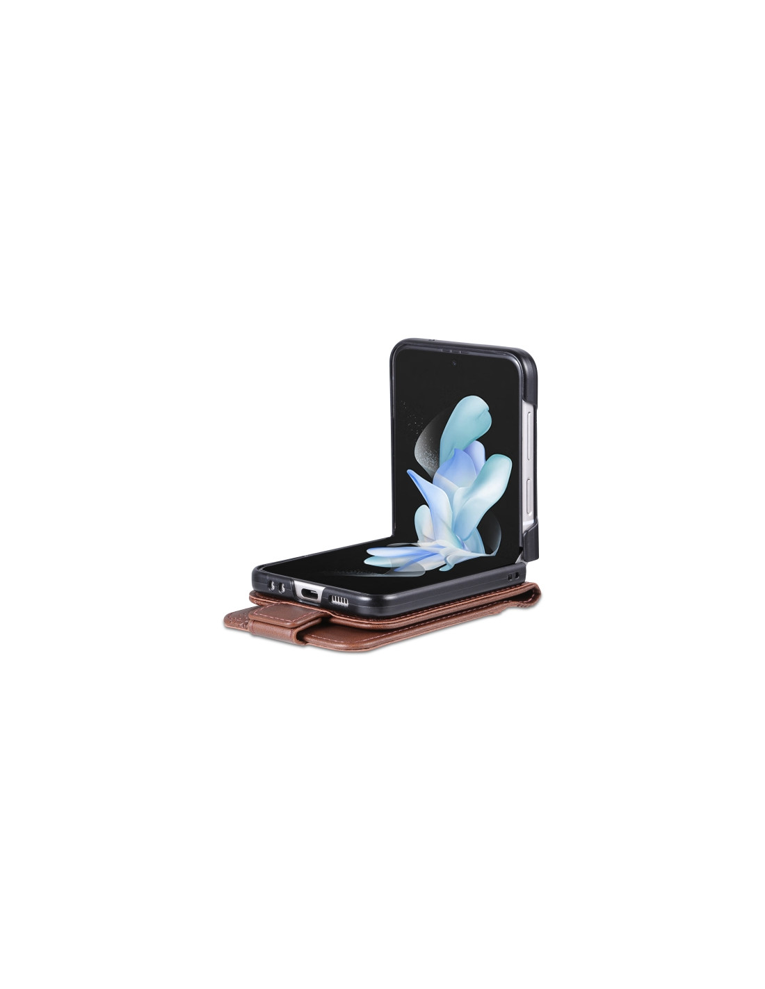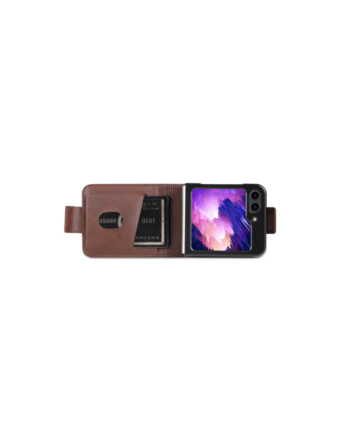 Cover a libro Galaxy Z Flip5 in pelle con texture vitello e chiusura magnetica. Protezione elegante e funzionale.