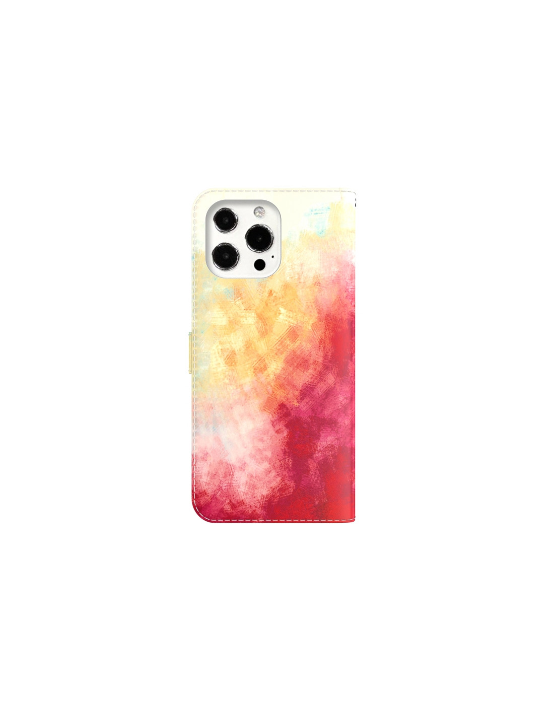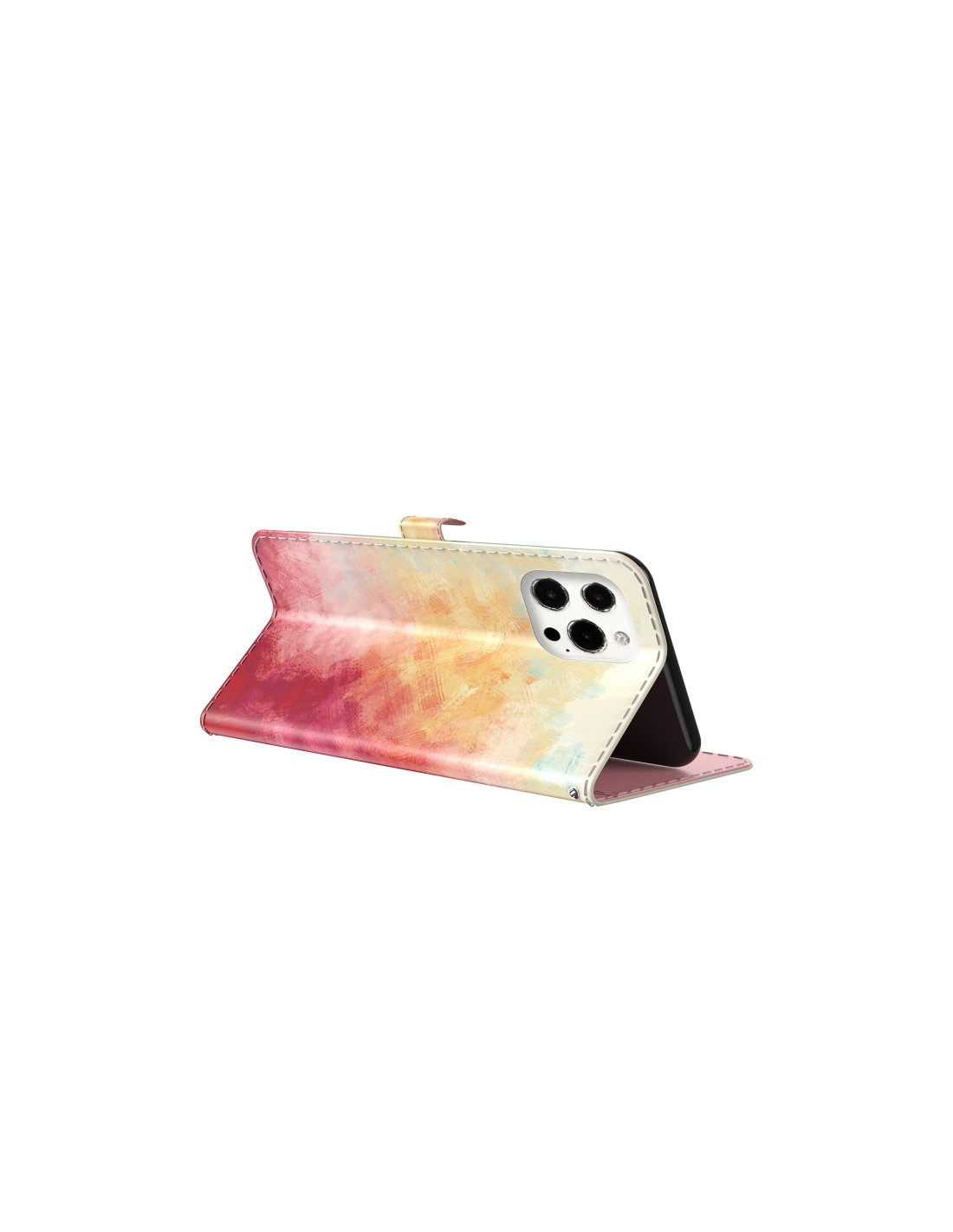 Cover a libro iPhone 13 Pro in pelle con fantasia acquerello. Portafoglio integrato con scomparti per carte e supporto.