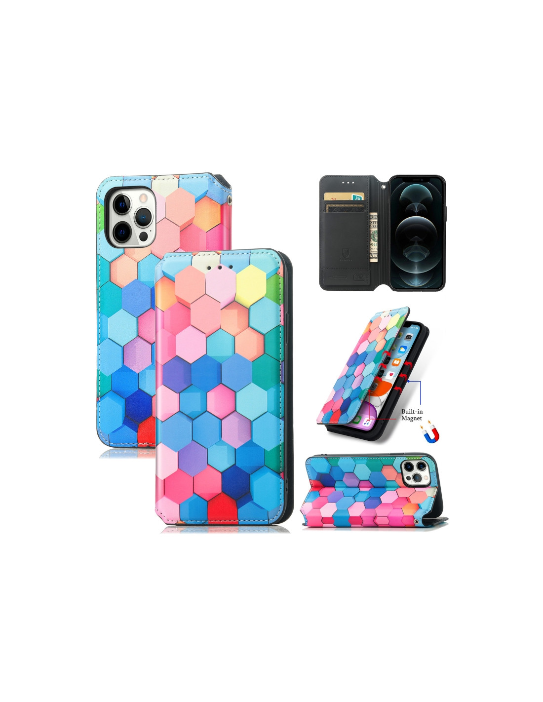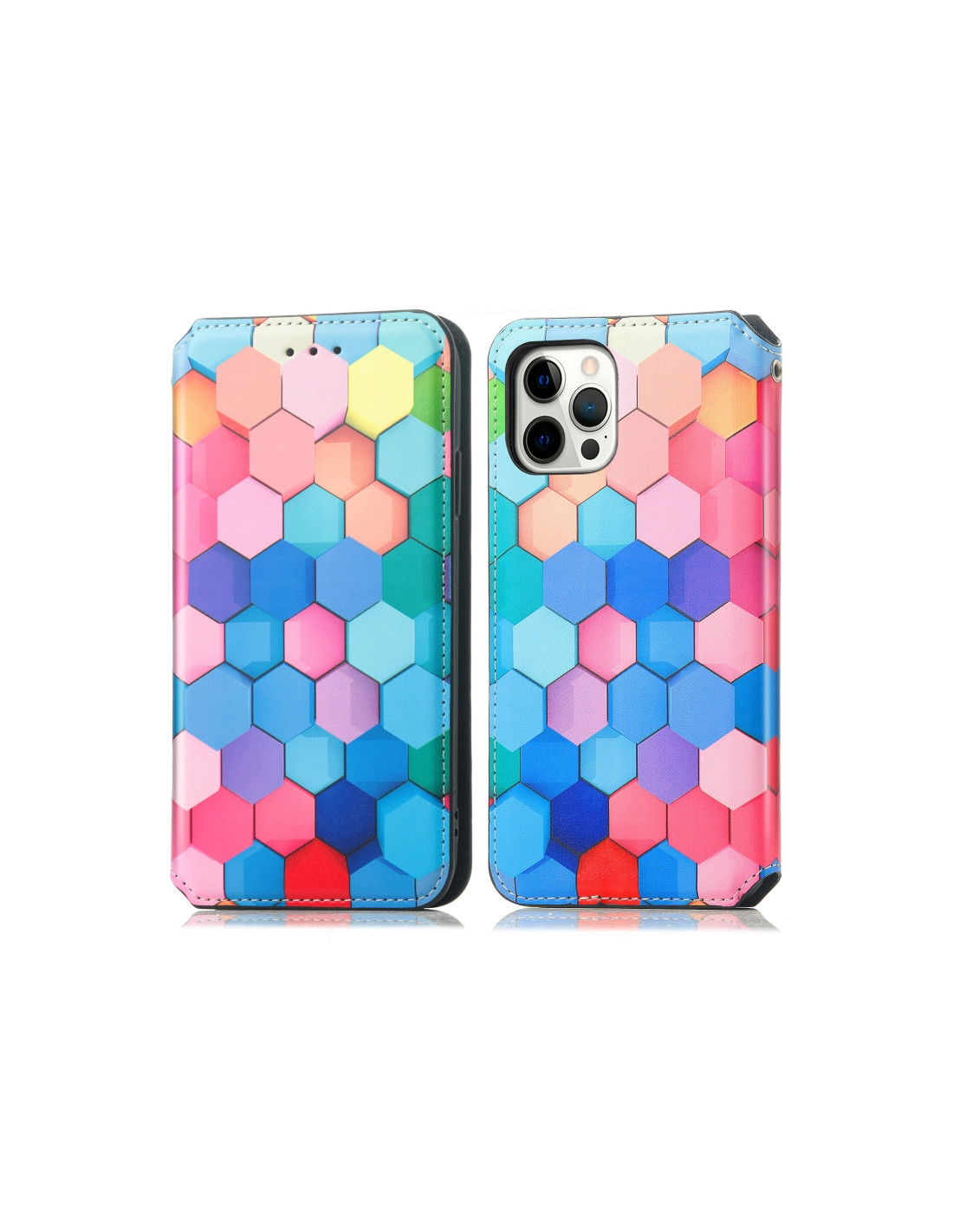Cover a libro in pelle PU per iPhone 13 Pro con design favo multicolore, supporto e scomparti per carte.