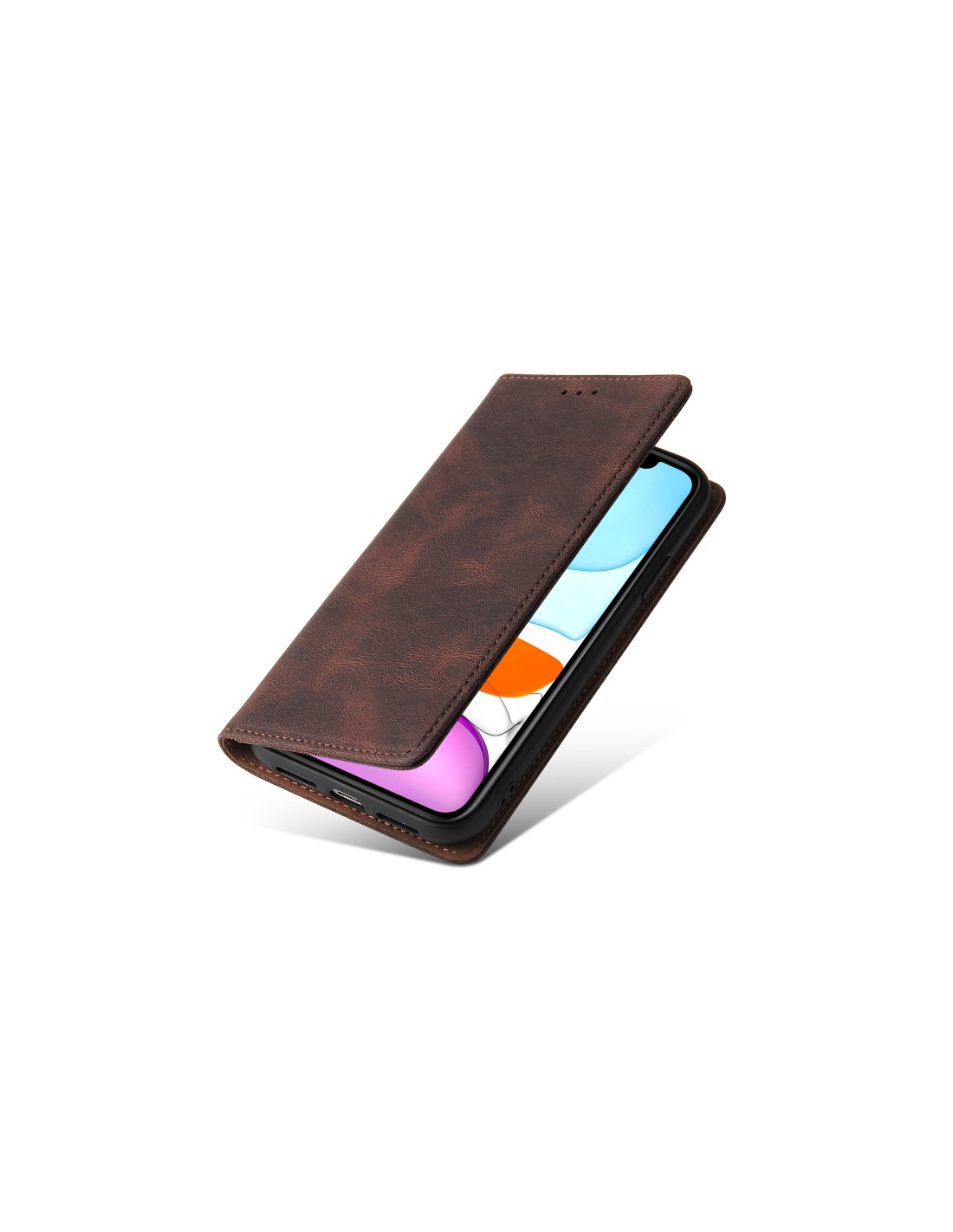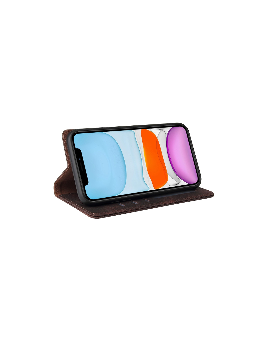 Cover a libro per iPhone 11 in pelle PU marrone con chiusura magnetica, scomparti per carte e portafoglio integrato.