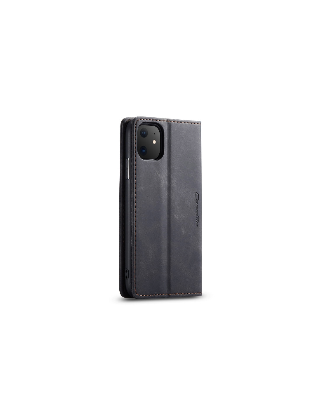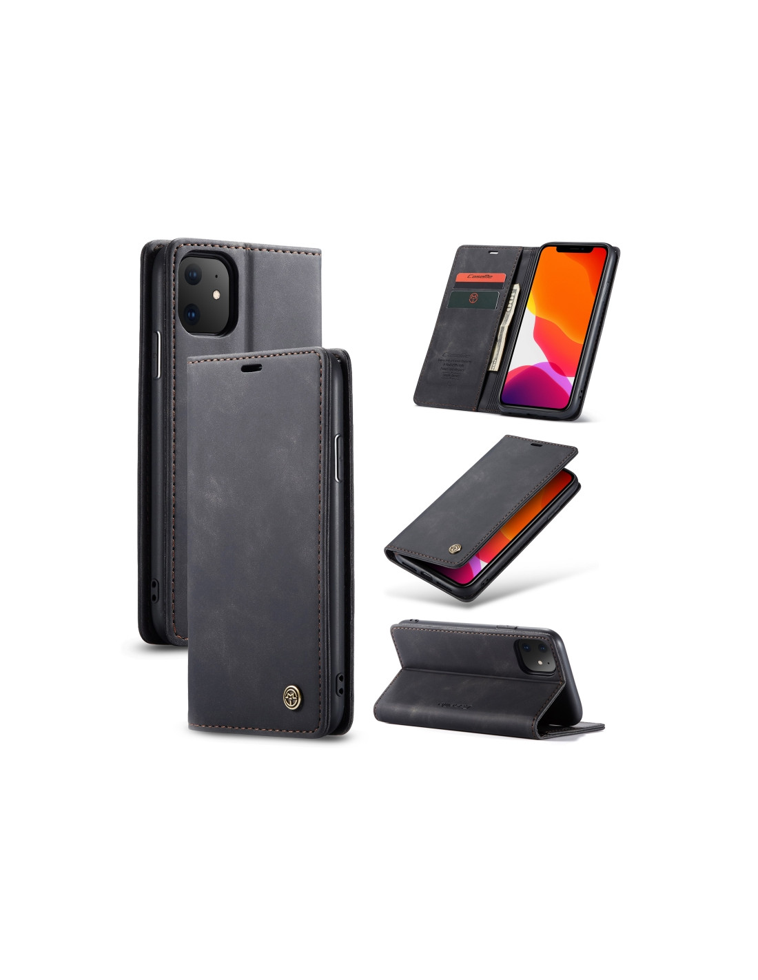 Cover a libro in pelle per iPhone 11 con portafoglio integrato, slot per carte e supporto. Design nero elegante.
