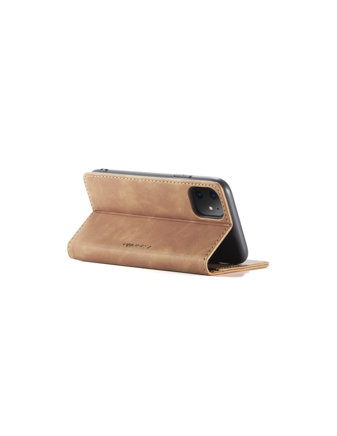 Cover a libro in pelle per iPhone 11 con portafoglio integrato, slot per carte e supporto. Design nero elegante.
