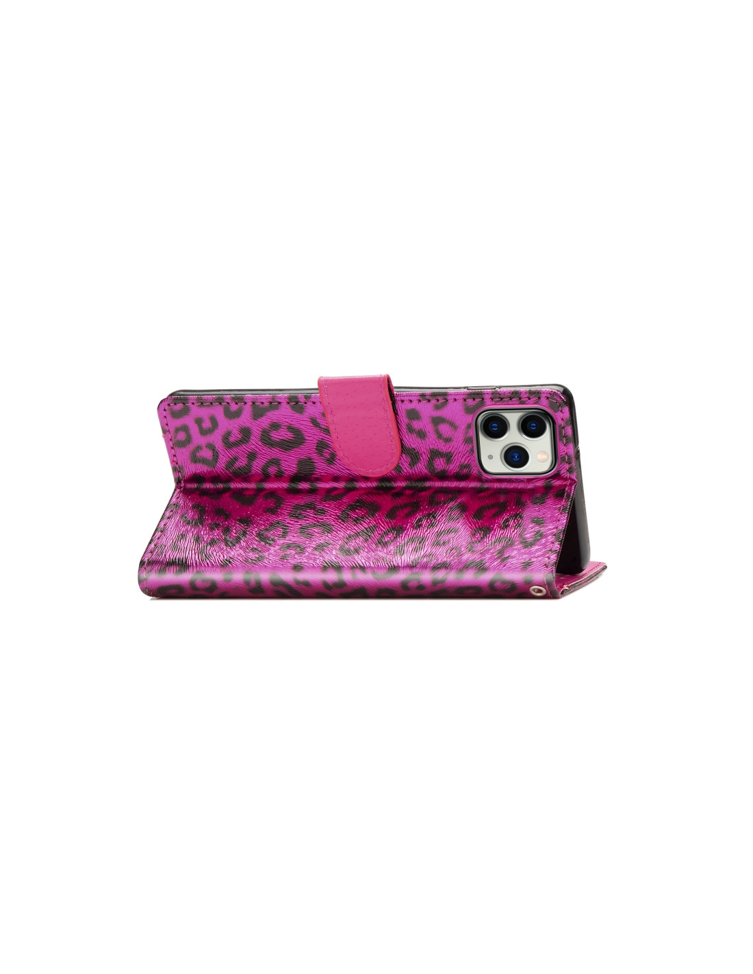 Cover a libro per iPhone 11 Pro Max con design leopardato, stand integrato e slot per carte. Protezione e stile in uno.