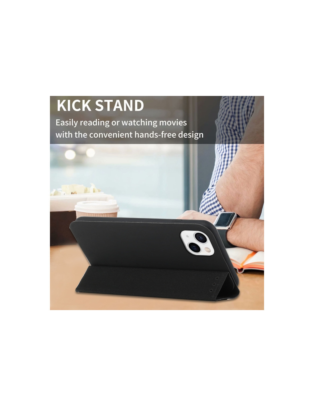Cover a libro in pelle PU per iPhone 13 con funzione supporto, scomparti per carte e portafoglio integrato.