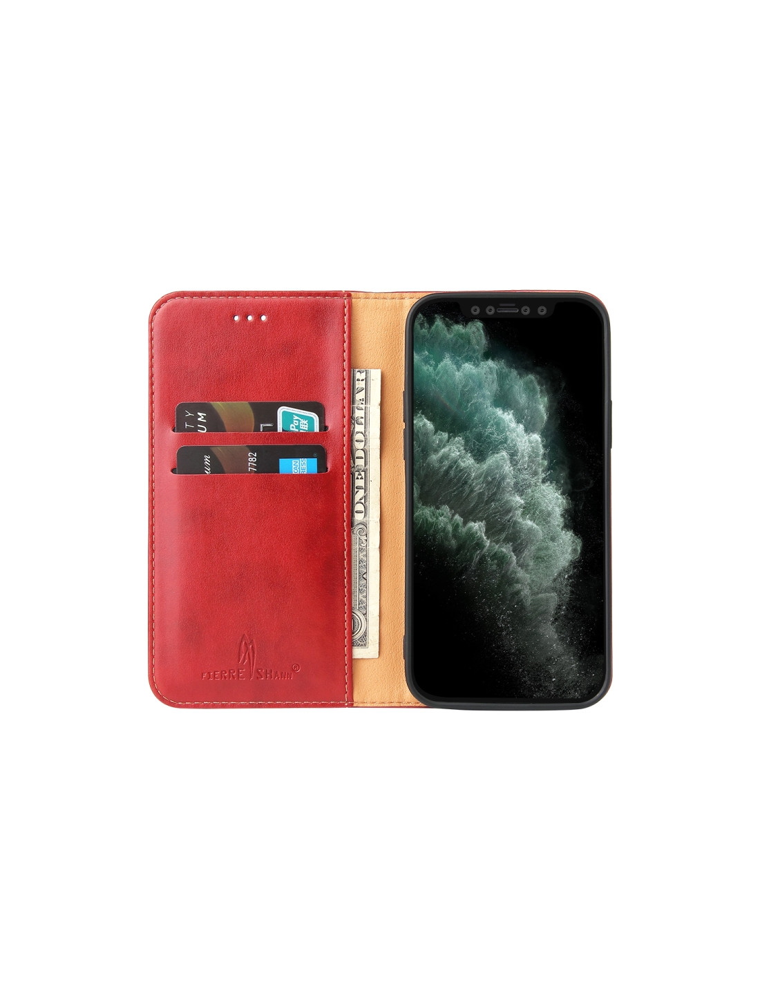Cover a libro in pelle PU per iPhone 13 con funzione supporto, scomparti per carte e portafoglio integrato.