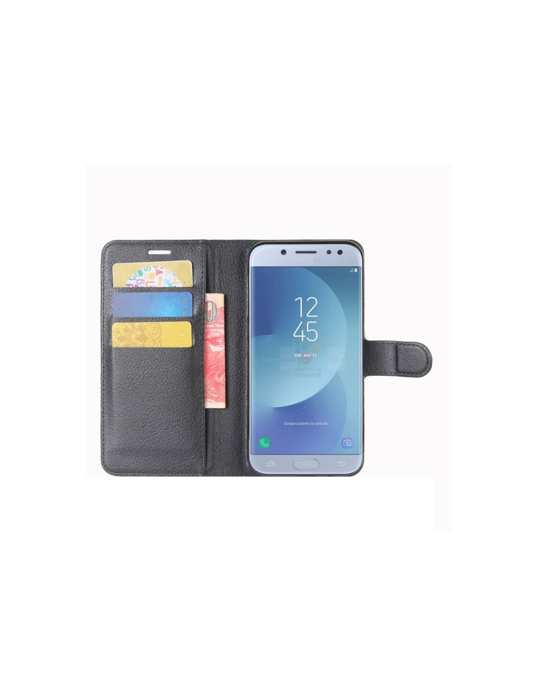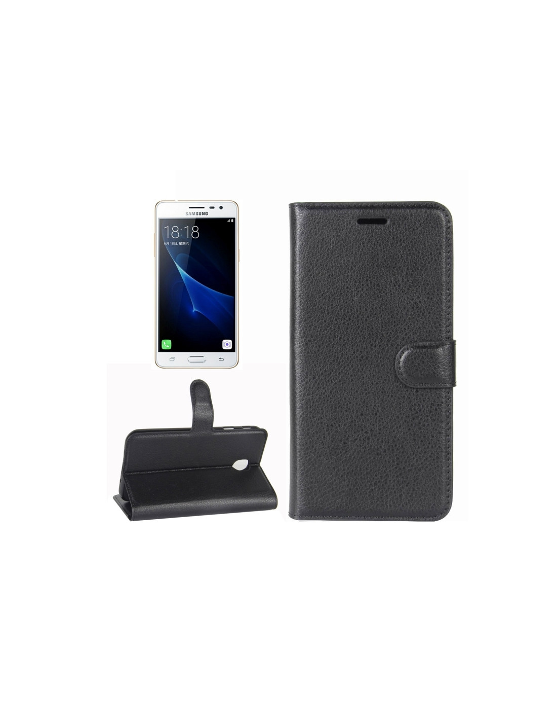 Cover a libro in pelle PU per Galaxy J3 2017 con texture litchi, scomparti carte e portafoglio integrato.