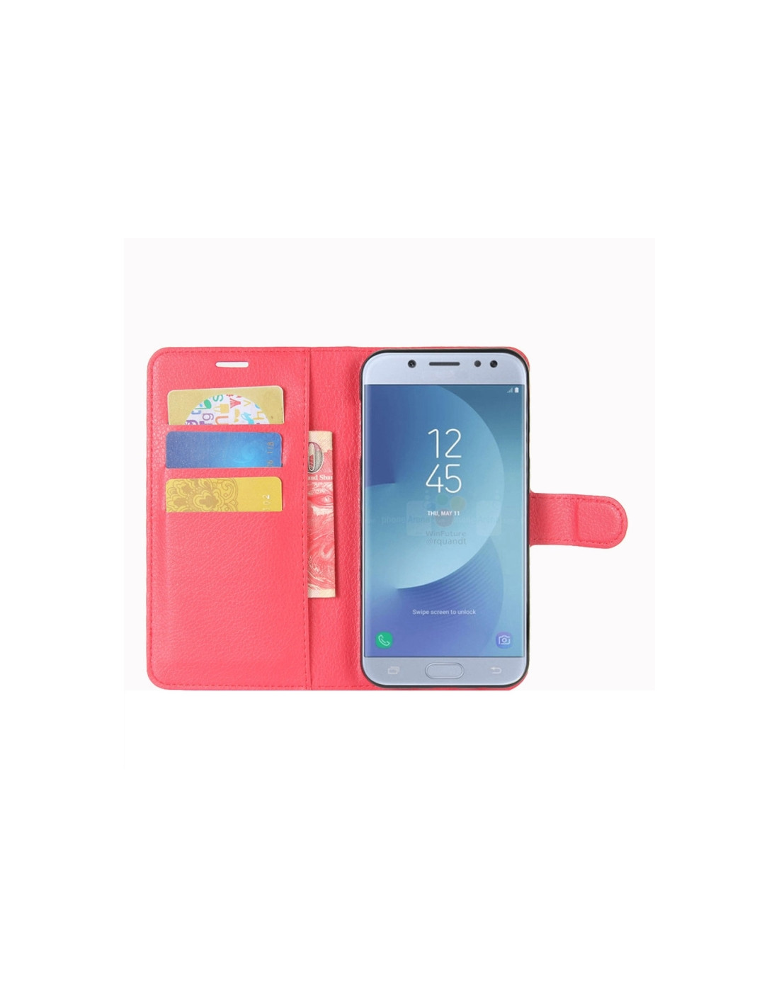 Cover a libro in pelle PU per Galaxy J3 2017 con texture litchi, scomparti carte e portafoglio integrato.
