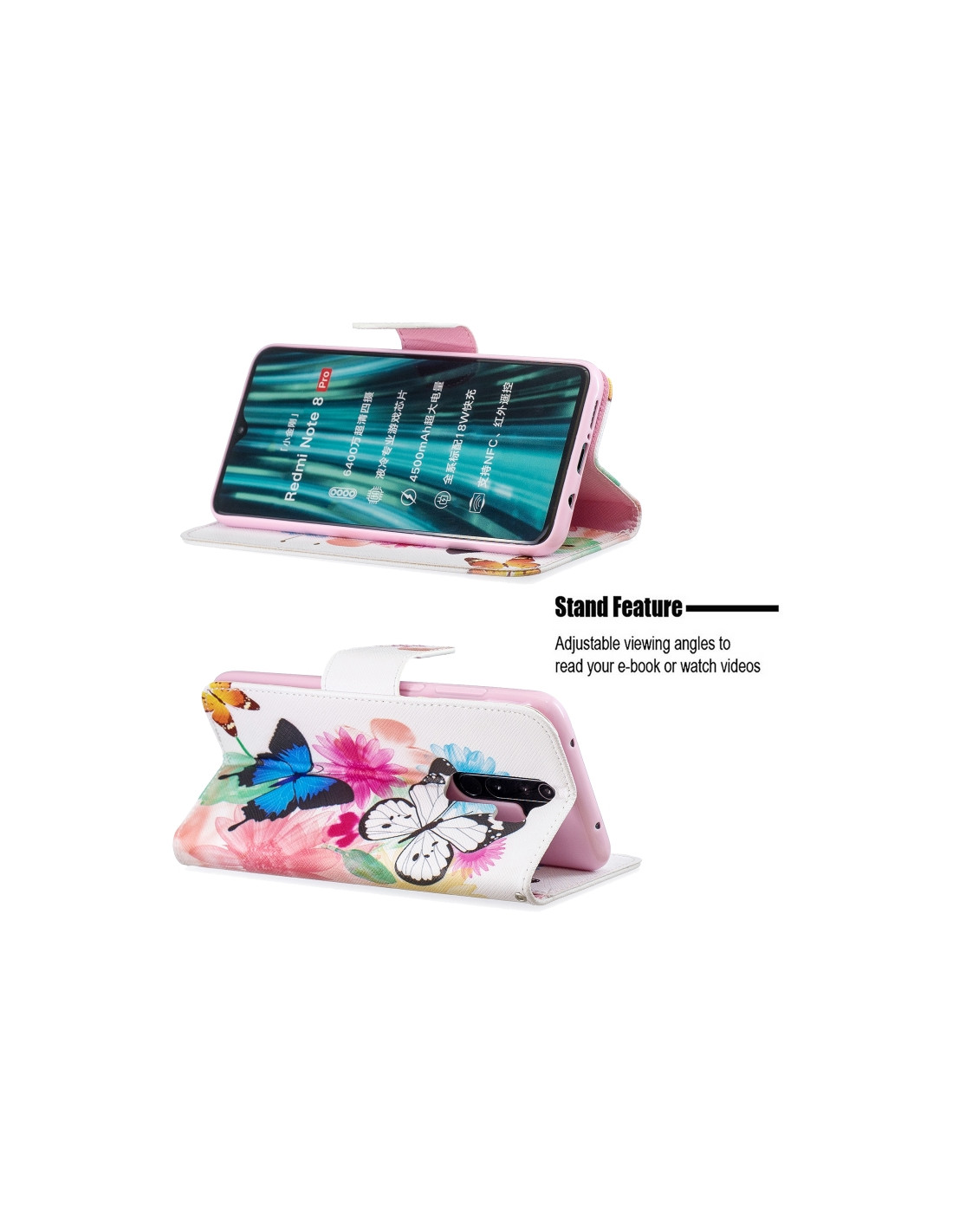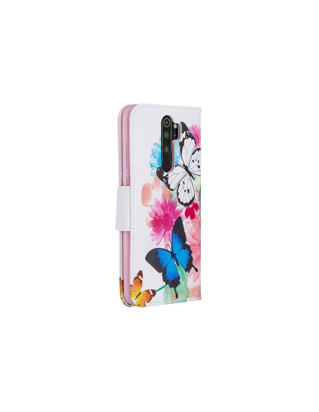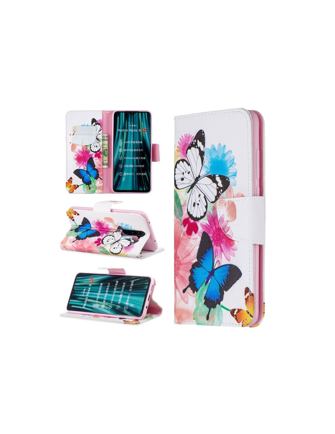 Cover a libro in pelle per Redmi Note 8 Pro con design farfalle, portafoglio integrato e slot per carte.