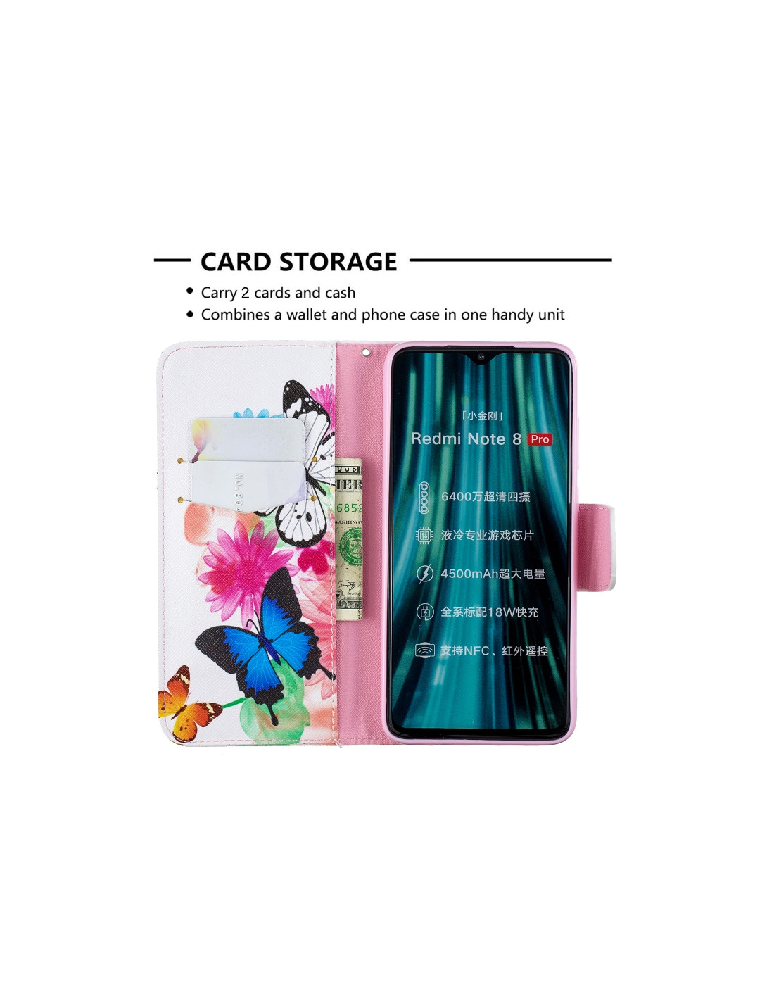 La cover a libro in pelle per Redmi Note 8 Pro combina eleganza e funzionalità. Il design con due farfalle colorate aggiunge un tocco artistico al tuo dispositivo, mentre la struttura a libro protegge lo schermo dalla polvere e dagli urti. Caratteristiche principali: