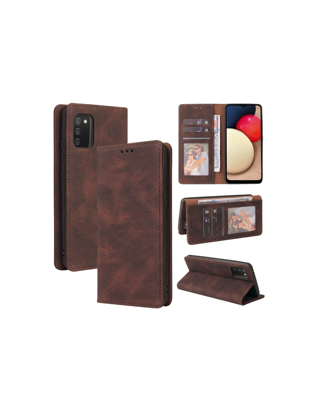 Cover flip in pelle per Galaxy A02s con chiusura a ventosa, scomparti per carte e portafoglio integrato.