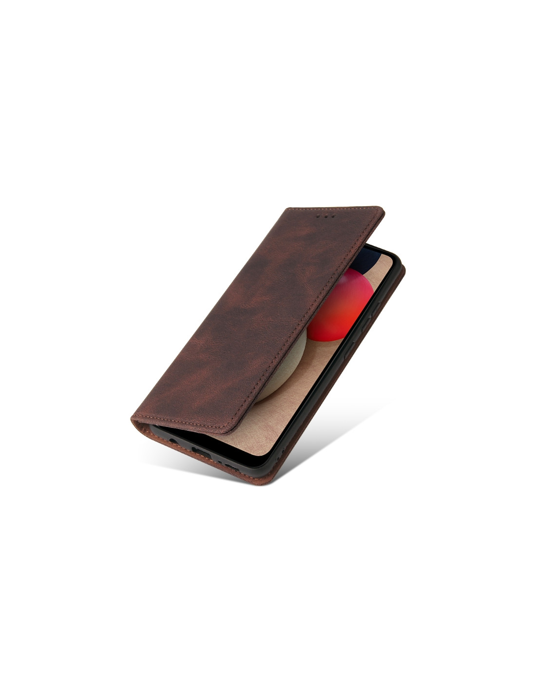Proteggi il tuo Samsung Galaxy A02s con questa elegante cover flip in pelle marrone. Grazie alla chiusura a ventosa semplice e intuitiva, il tuo dispositivo rimane sempre al sicuro durante l'uso quotidiano. Il design a libro protegge sia lo schermo che il retro del telefono.