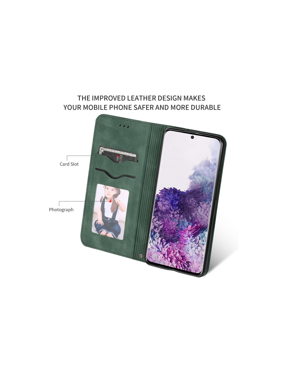 SamsungLa cover a libro per Galaxy S20 combina eleganza e praticità con un design retrò dal sapore business. Realizzata in pelle sintetica PU di qualità, offre una protezione completa del display e del retro del telefono. La chiusura magnetica mantiene il dispositivo sicuro, mentre il colore verde militare conferisce un aspetto sofisticato e professionale.