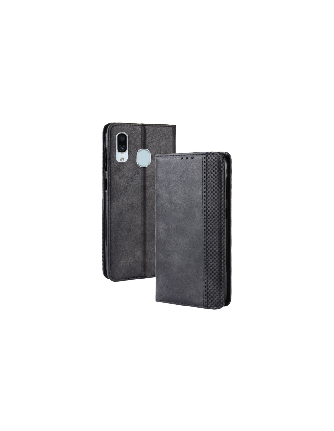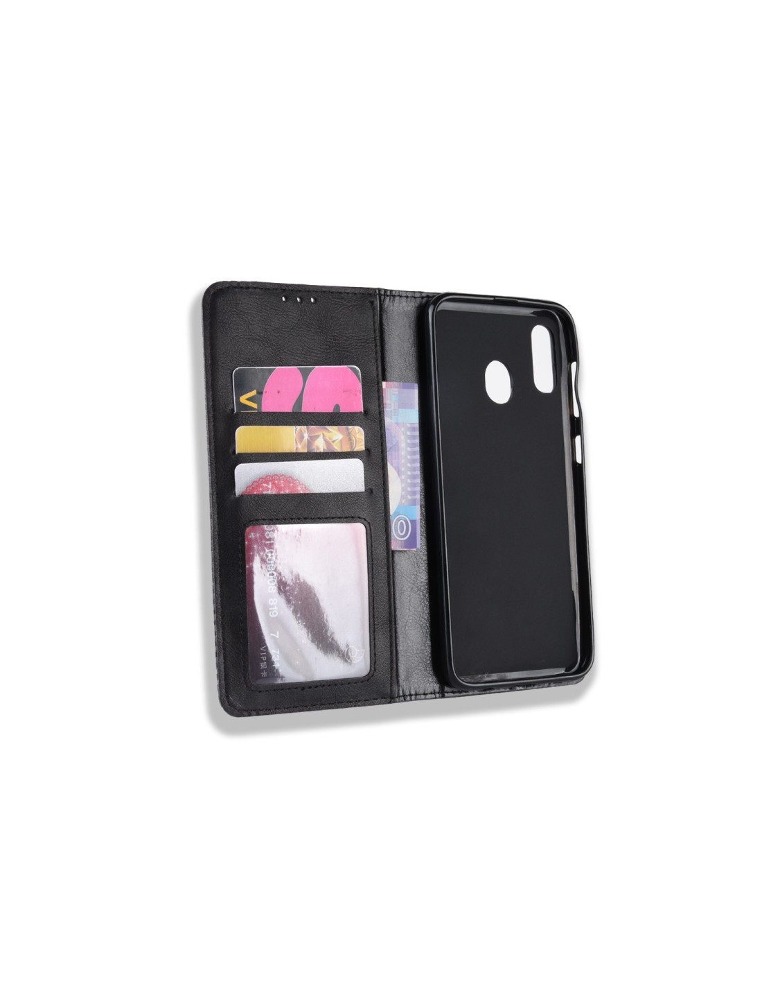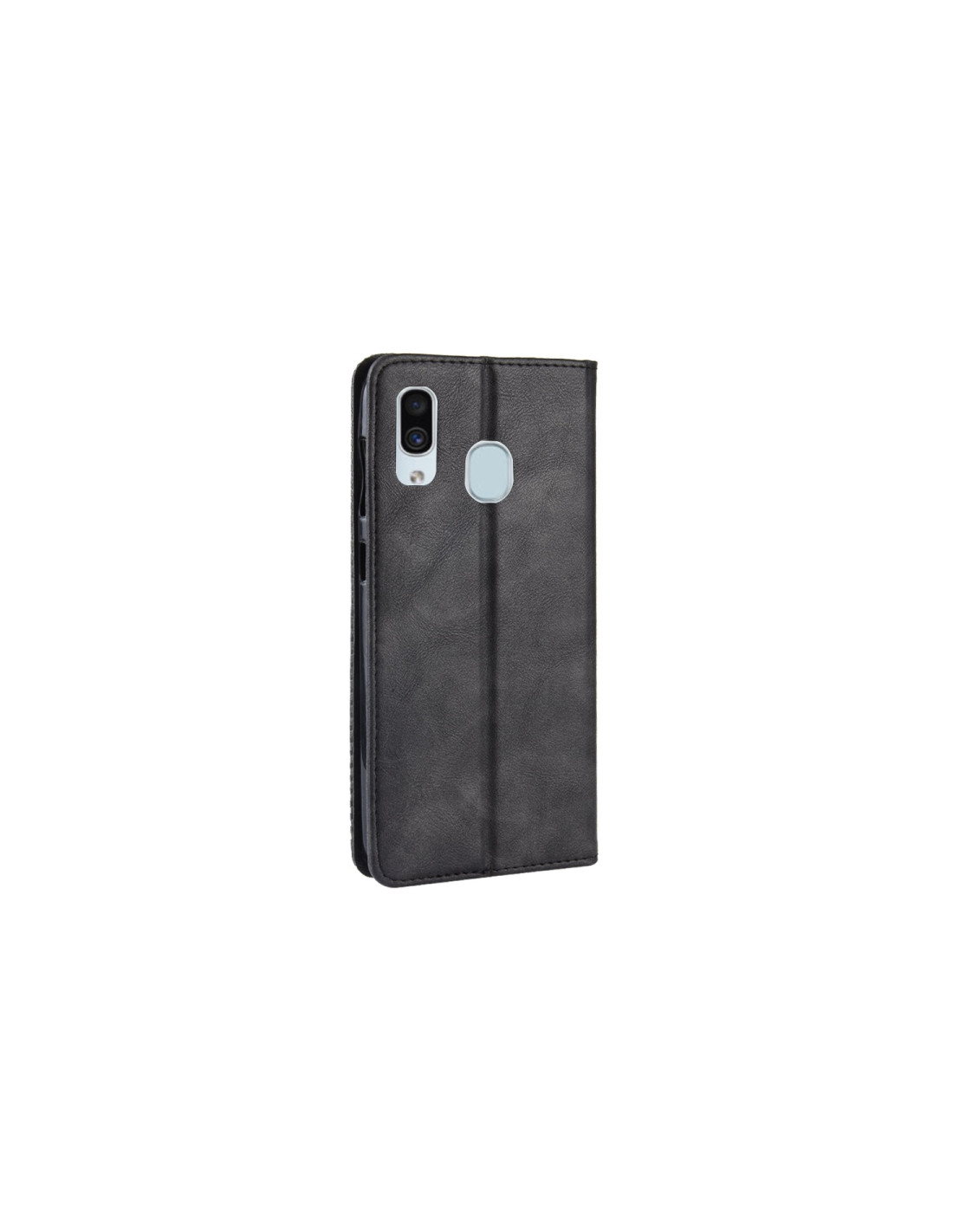 La cover a libro per Galaxy A20e combina stile retrò e funzionalità pratica. Realizzata in pelle sintetica Crazy Horse di qualità, questa custodia offre protezione completa dello schermo e della scocca del tuo smartphone.