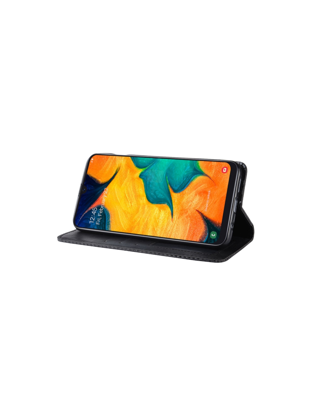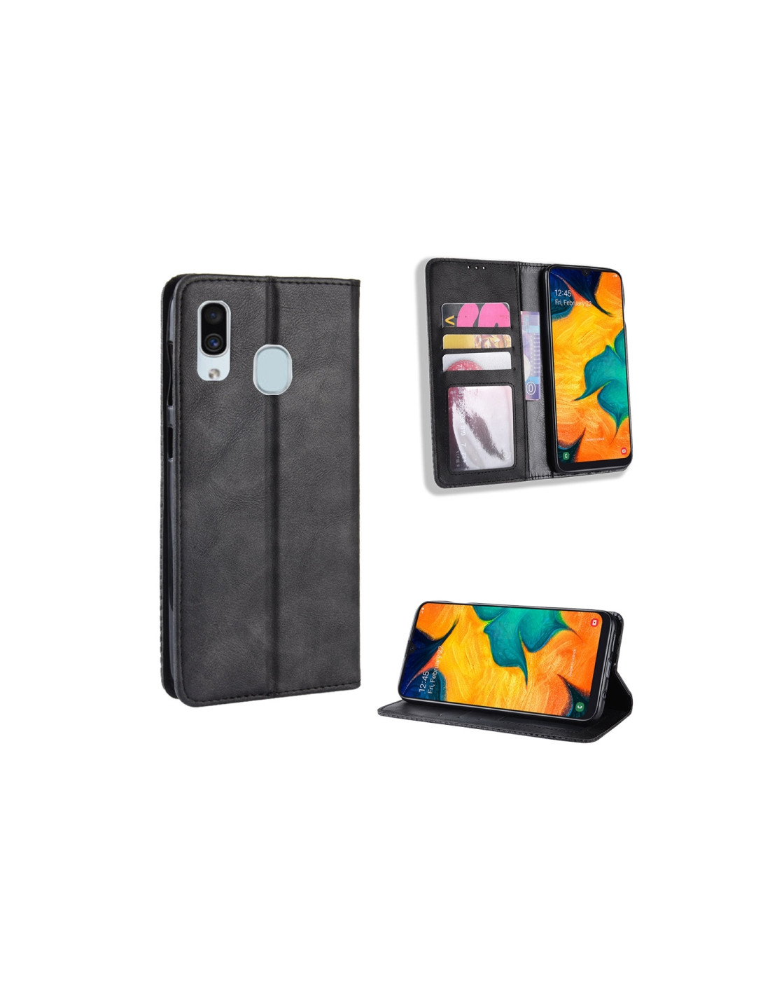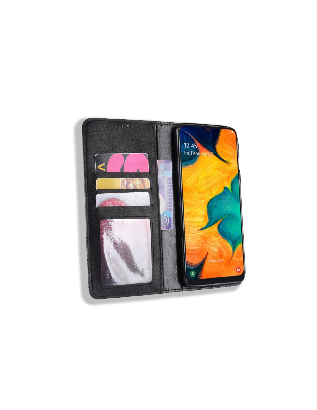 Cover a libro Galaxy A20e in pelle Crazy Horse con chiusura magnetica, porta carte e supporto. Protezione completa e pratica.
