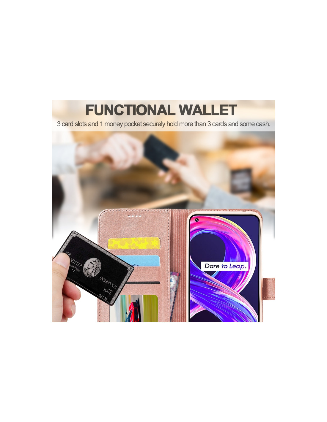 La cover Oppo Realme C11 KHAZNEH combina protezione e praticità in un elegante design a libro. Realizzata in PU e TPU di qualità, offre una resistenza superiore agli urti e alle cadute.