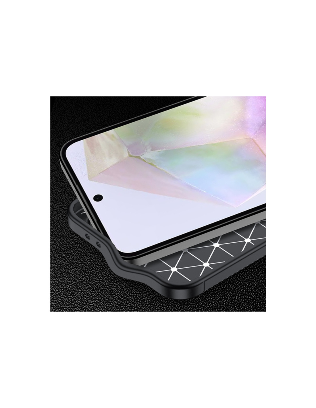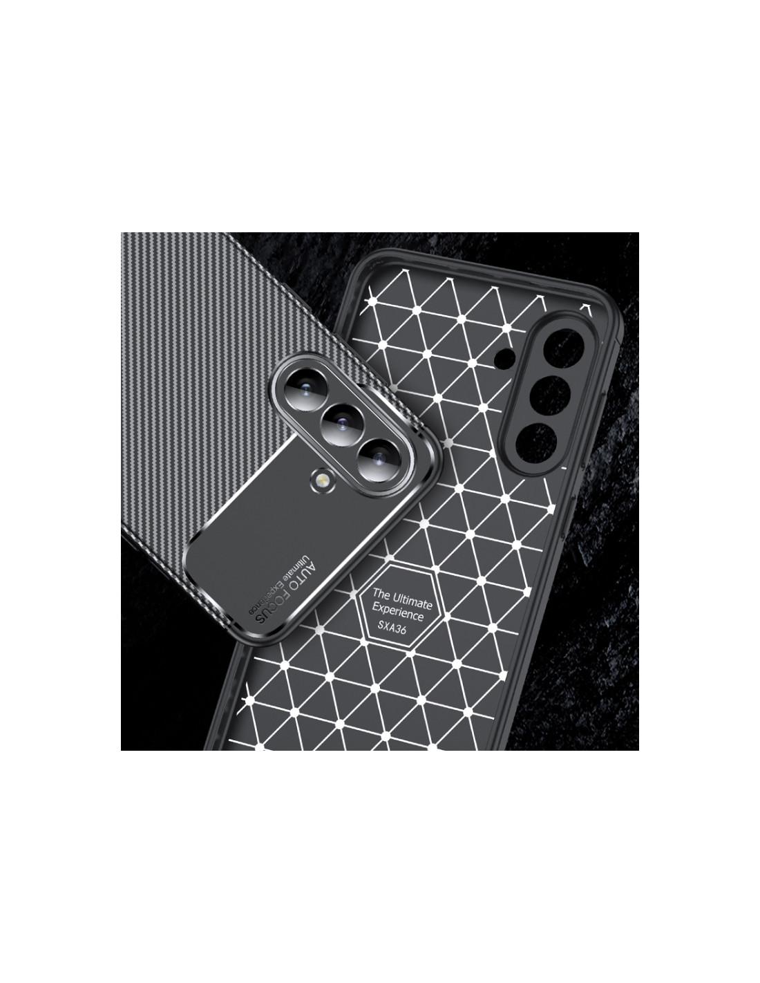 Cover antiurto per Galaxy A36 5G in TPU con design fibra di carbonio nero. Protezione robusta e stile moderno.
