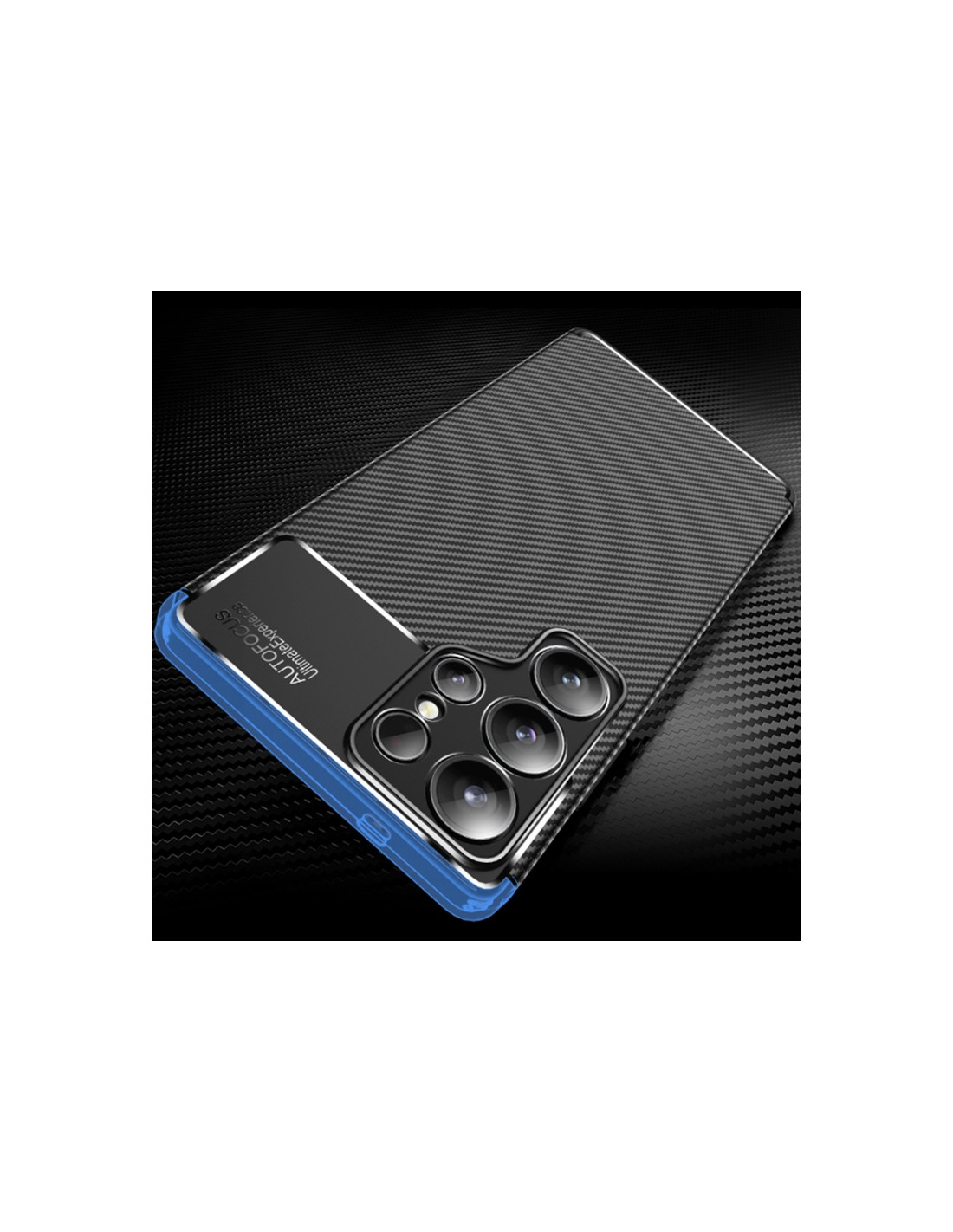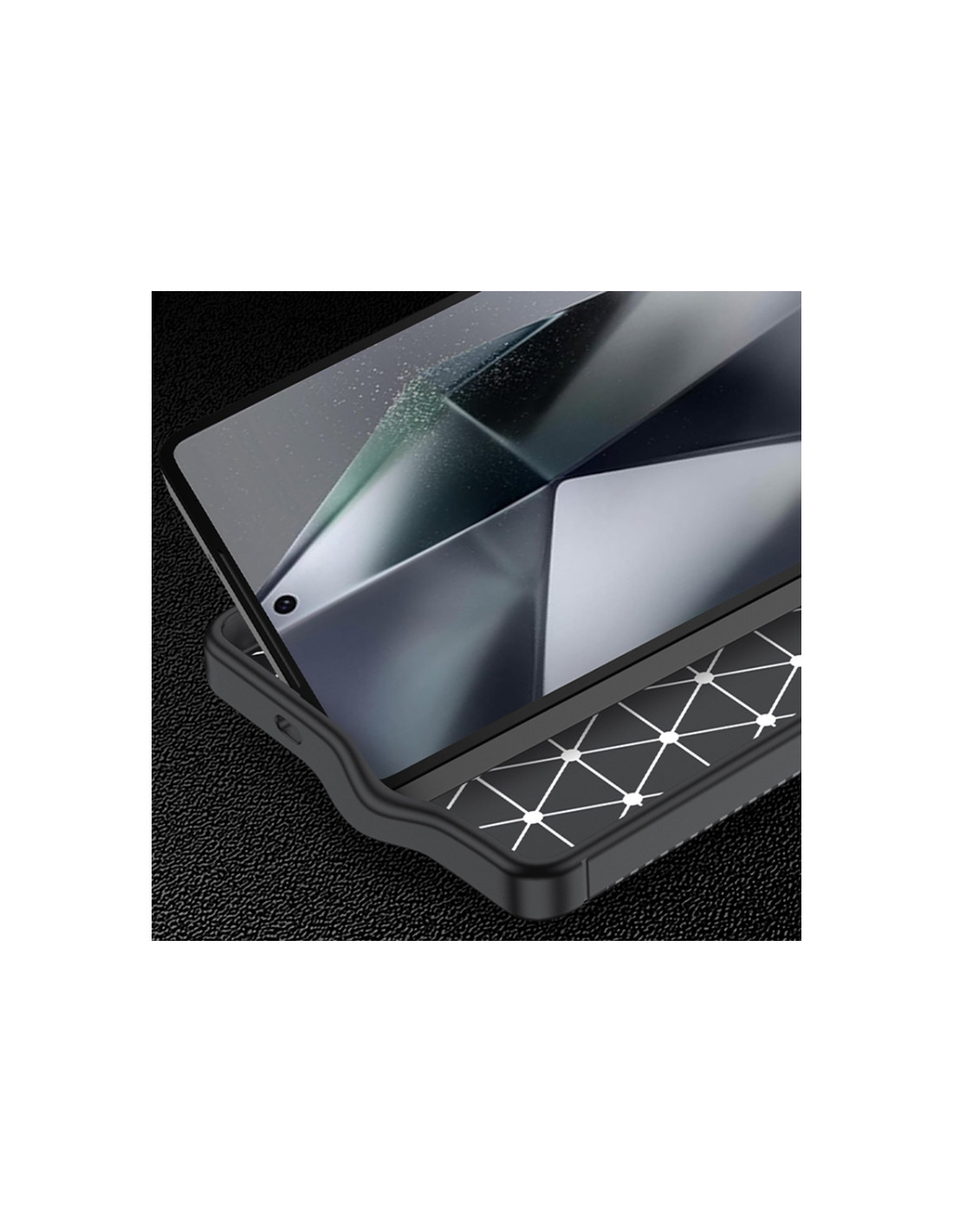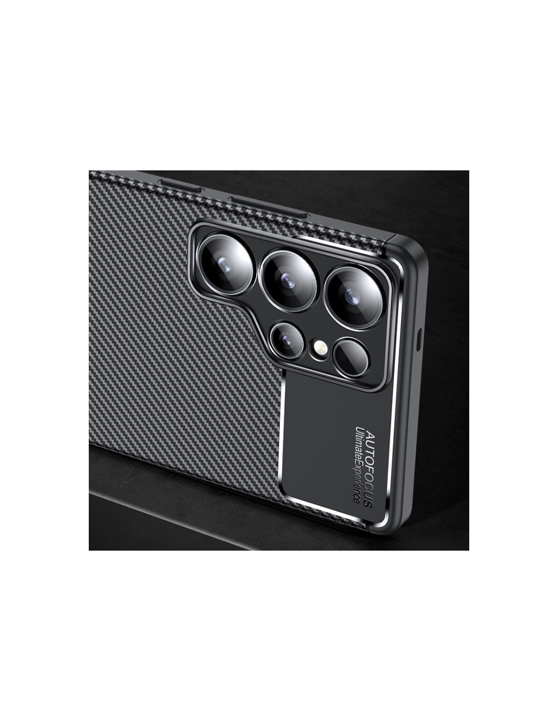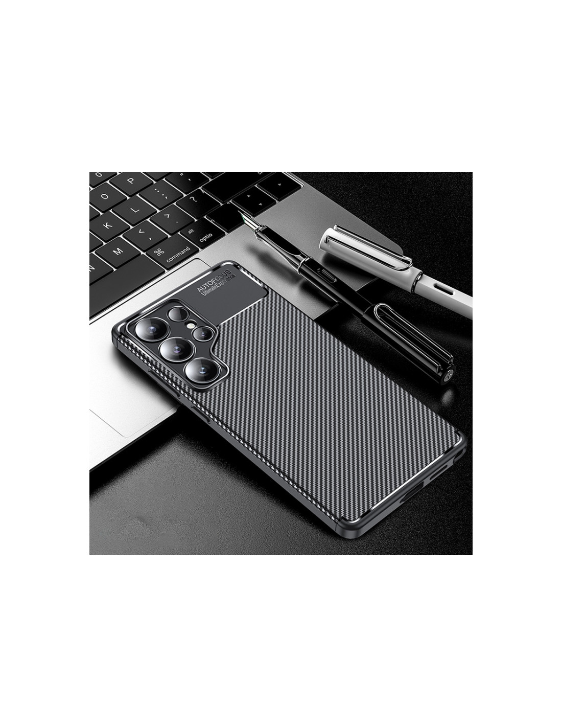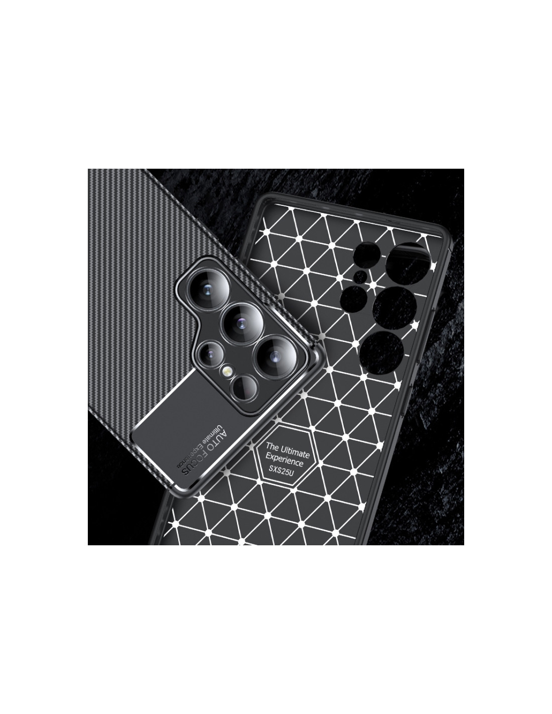 Cover antiurto Galaxy S25 Ultra in TPU con texture fibra di carbonio. Protezione robusta e design elegante.