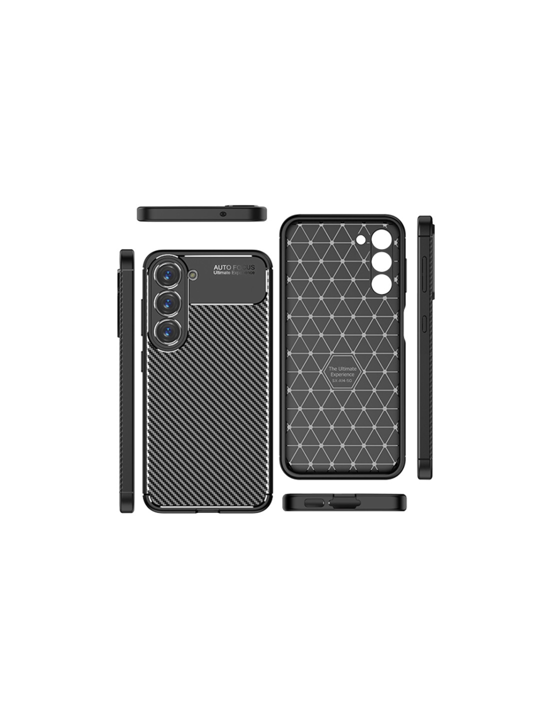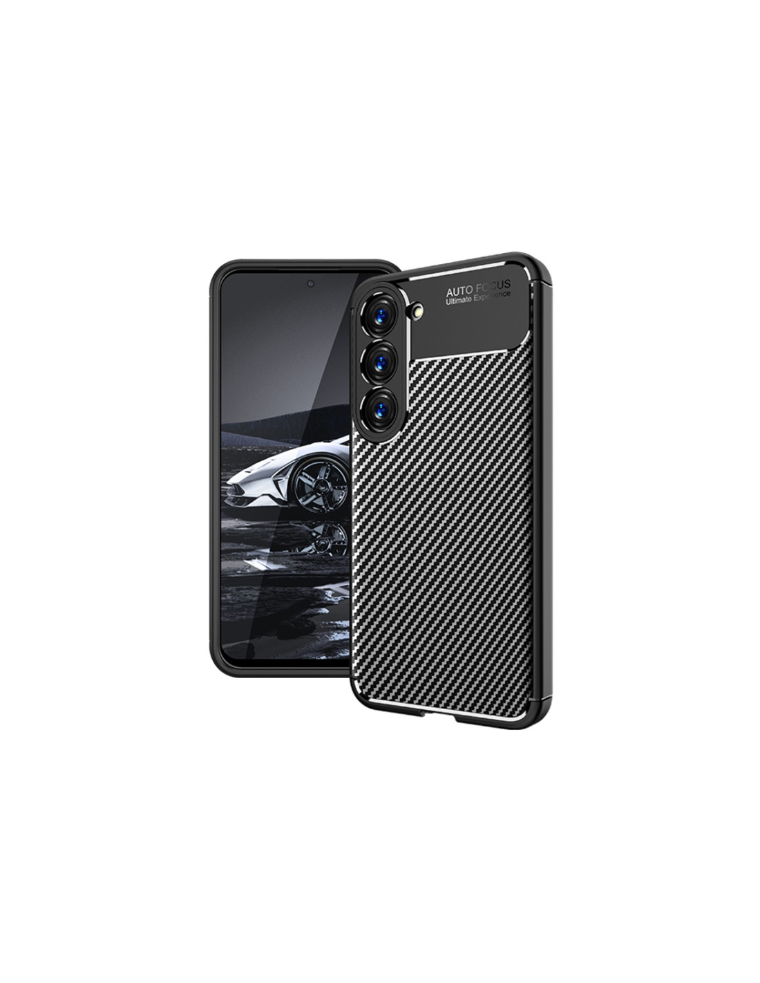 Cover antiurto Galaxy S23 in TPU con texture fibra di carbonio nero. Protezione robusta e design elegante.