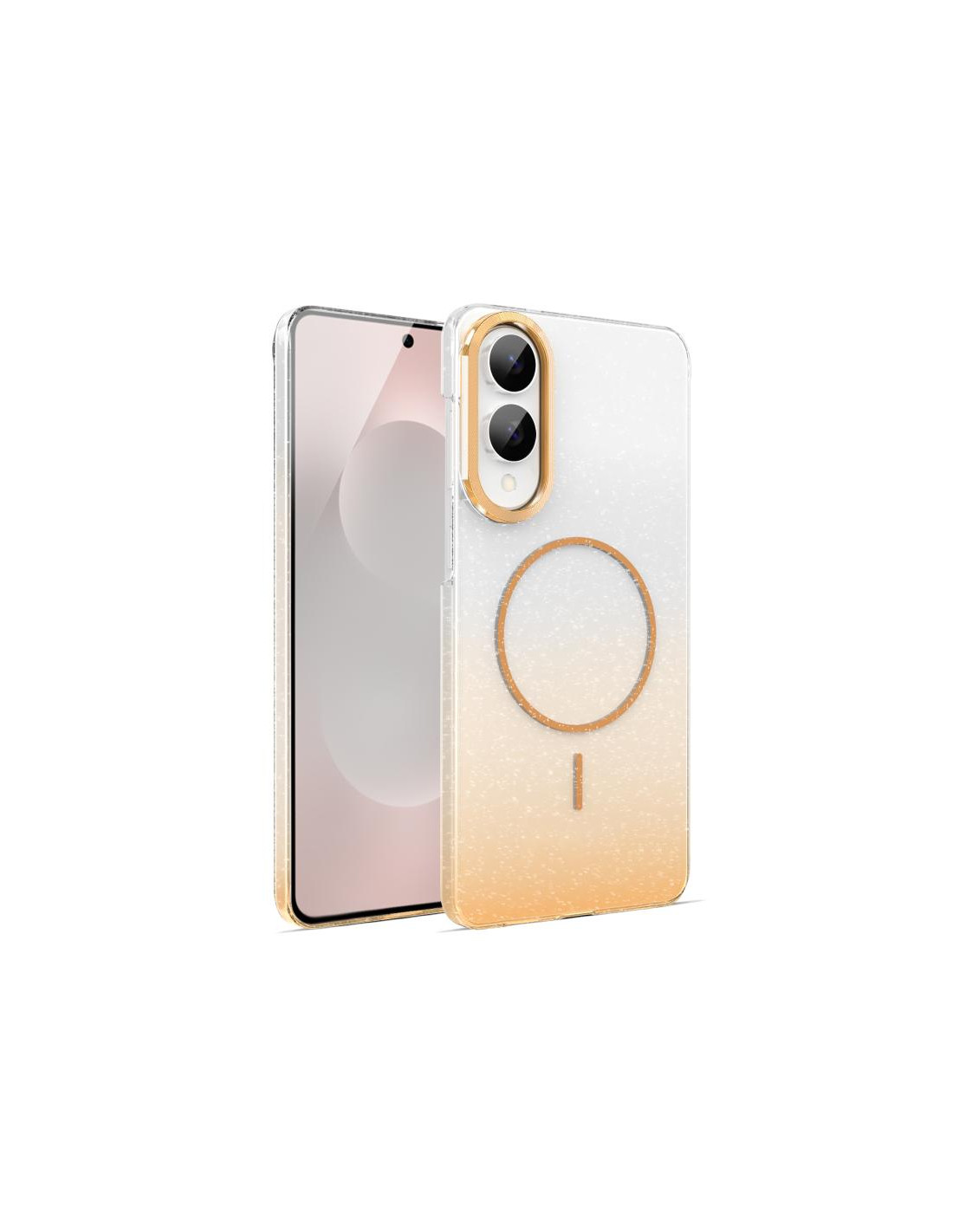 Cover antiurto per Galaxy S25 5G con design glitterato sfumato oro e protezione MagSafe integrata.