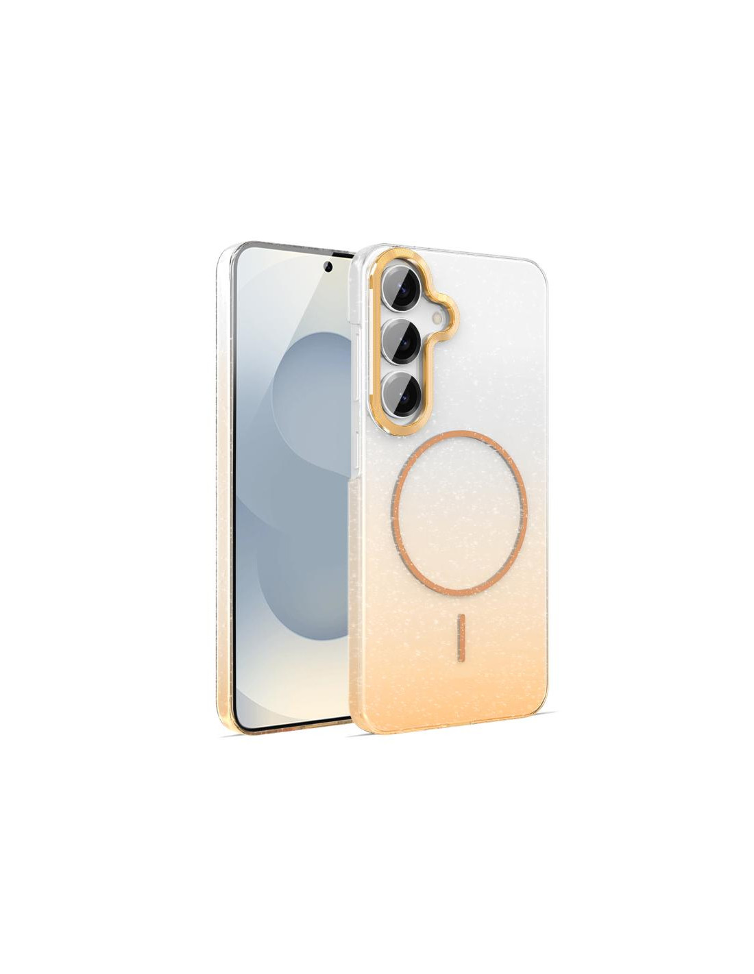 Cover antiurto per Galaxy S25 5G con design glitterato sfumato oro e protezione MagSafe integrata.