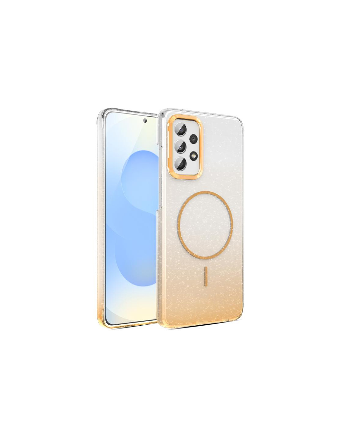 SamsungLa cover per Galaxy A52 5G di Melacompro combina stile e protezione con un design glitterato sfumato in tonalità oro e viola. Realizzata con tecnologia MagSafe, ti consente di utilizzare accessori magnetici compatibili e supporti per auto in tutta comodità.
