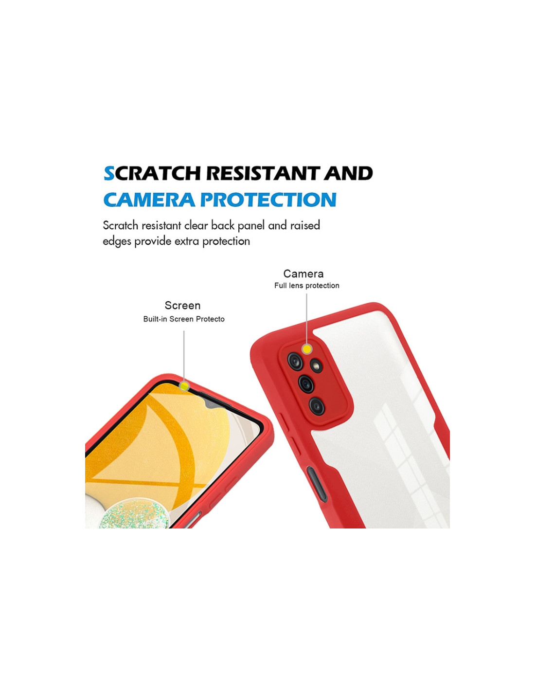 La cover per Galaxy A13 5G è realizzata in acrilico e TPU per garantire una protezione completa e duratura del tuo dispositivo. Il design a copertura totale a 360 gradi protegge sia il dorso che i bordi del telefono, assorbendo efficacemente gli urti accidentali. La combinazione di materiali acrilici e TPU offre un eccellente equilibrio tra rigidità e flessibilità, prevenendo danni da cadute e impatti. Caratteristiche principali:
