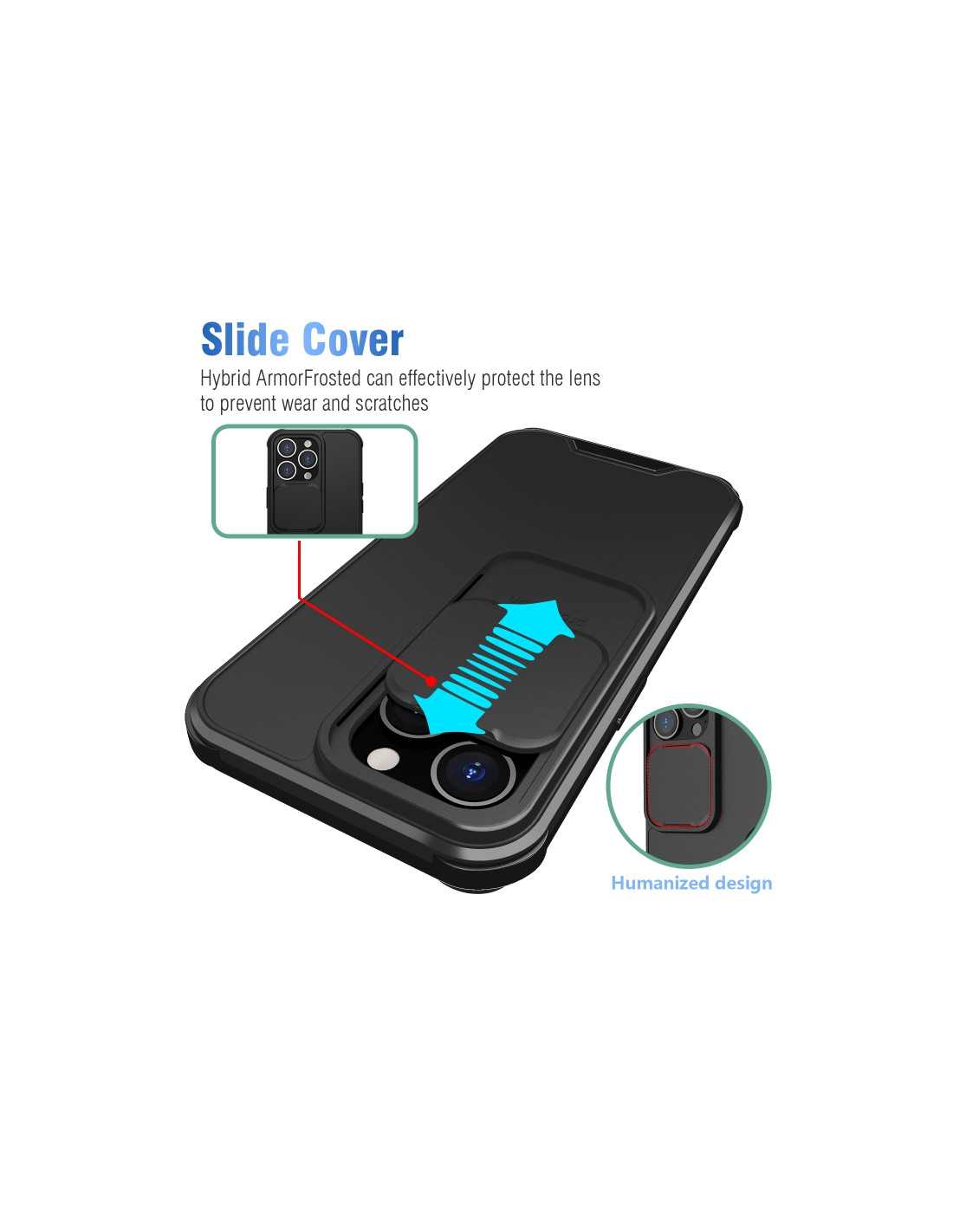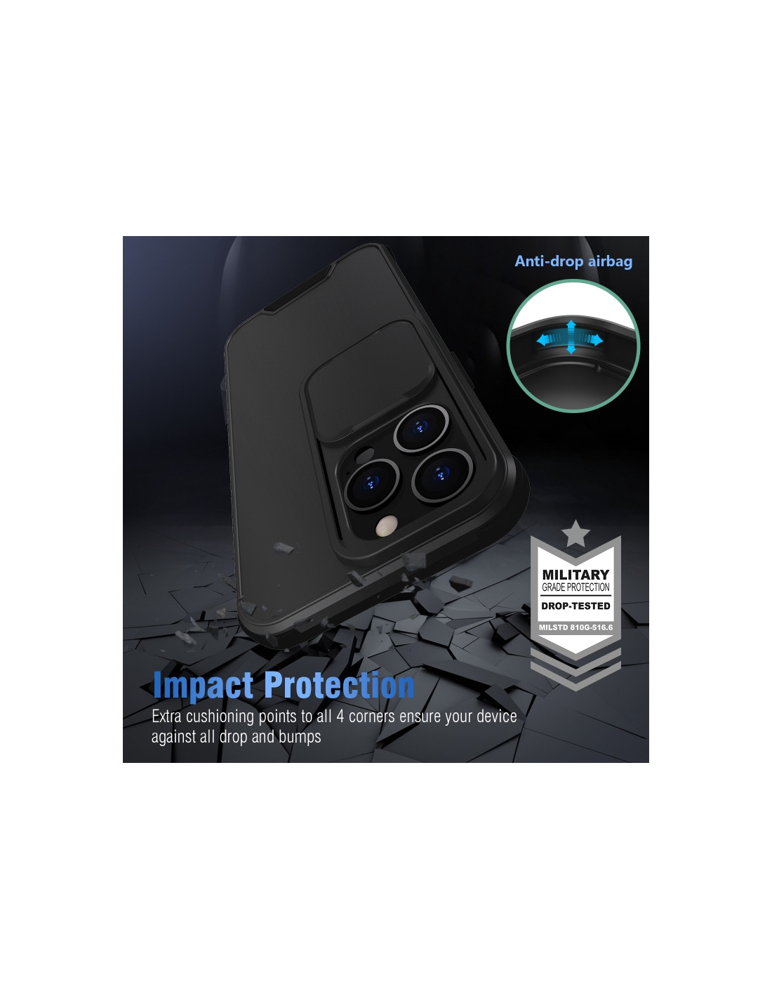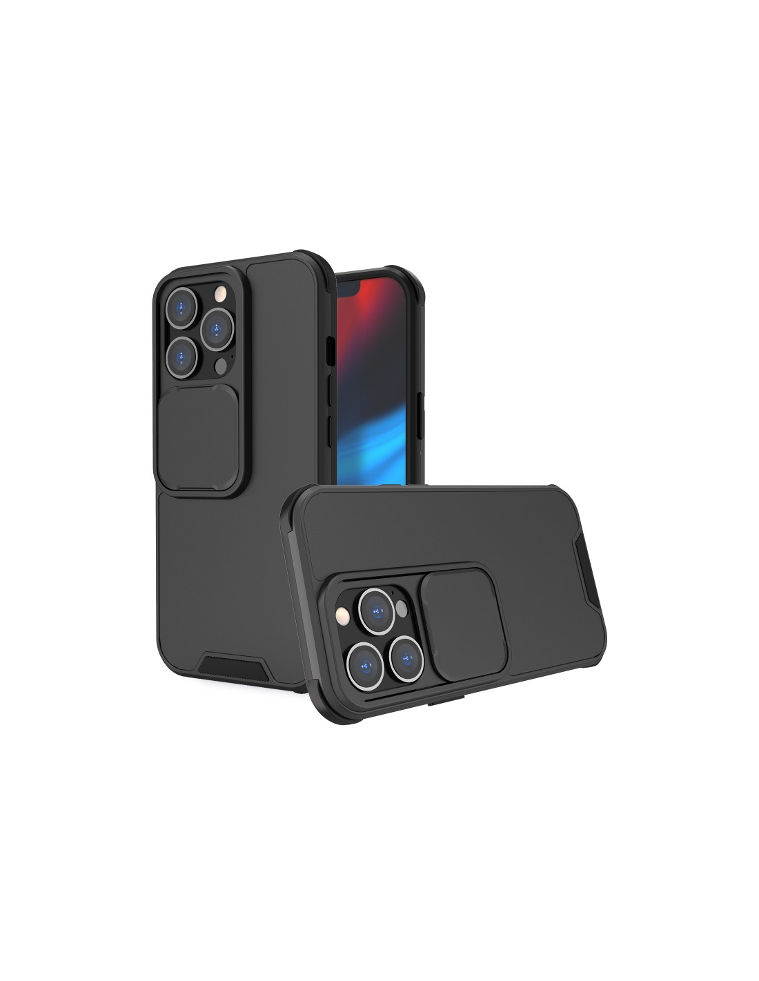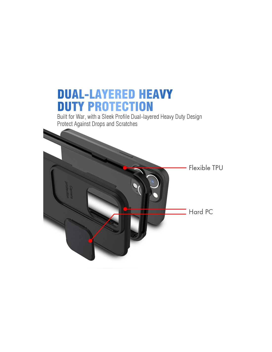 Cover iPhone 13 in TPU e PC con protezione antiurto e pratico sistema di scorrimento per la fotocamera.
