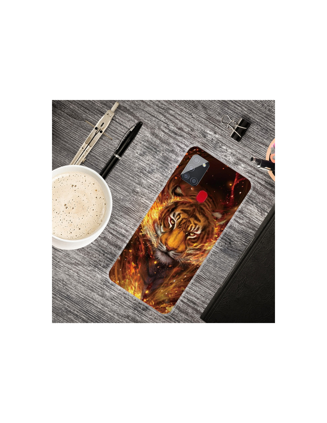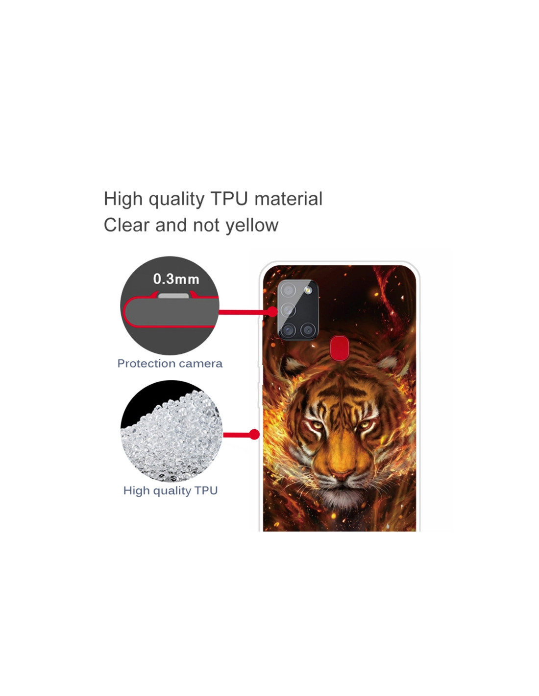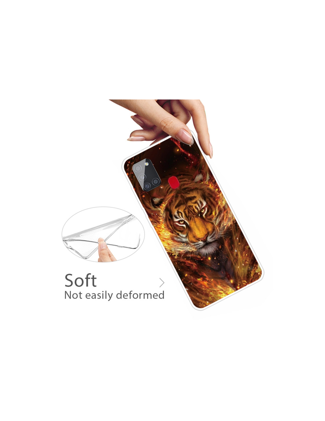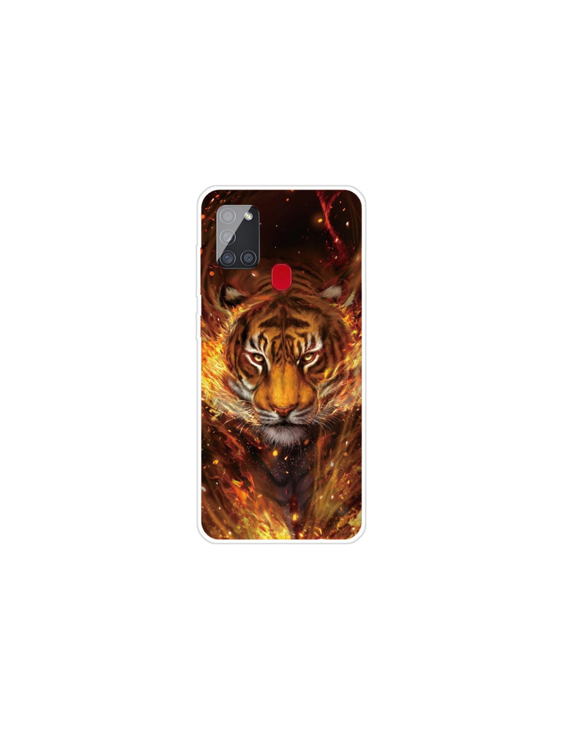 Cover antiurto per Galaxy A21S in TPU trasparente con design Tigre di Fuoco. Protezione totale con stile.