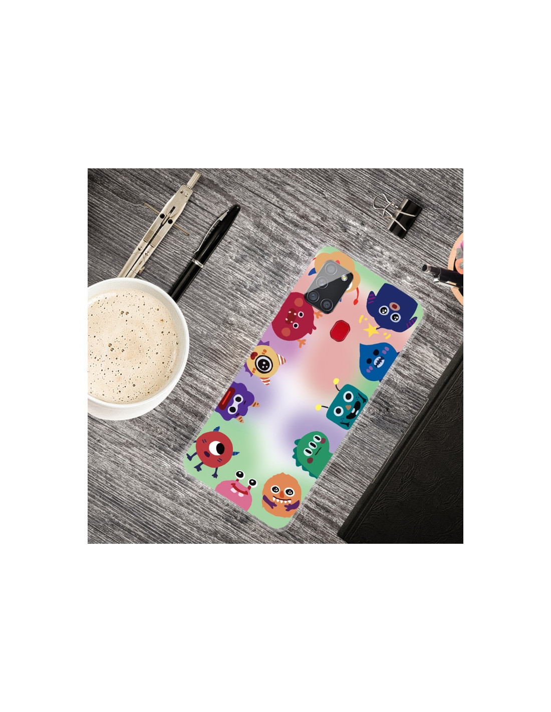Cover antiurto Galaxy A21S in TPU trasparente con design mostro fluorescente. Protezione totale e stile unico.