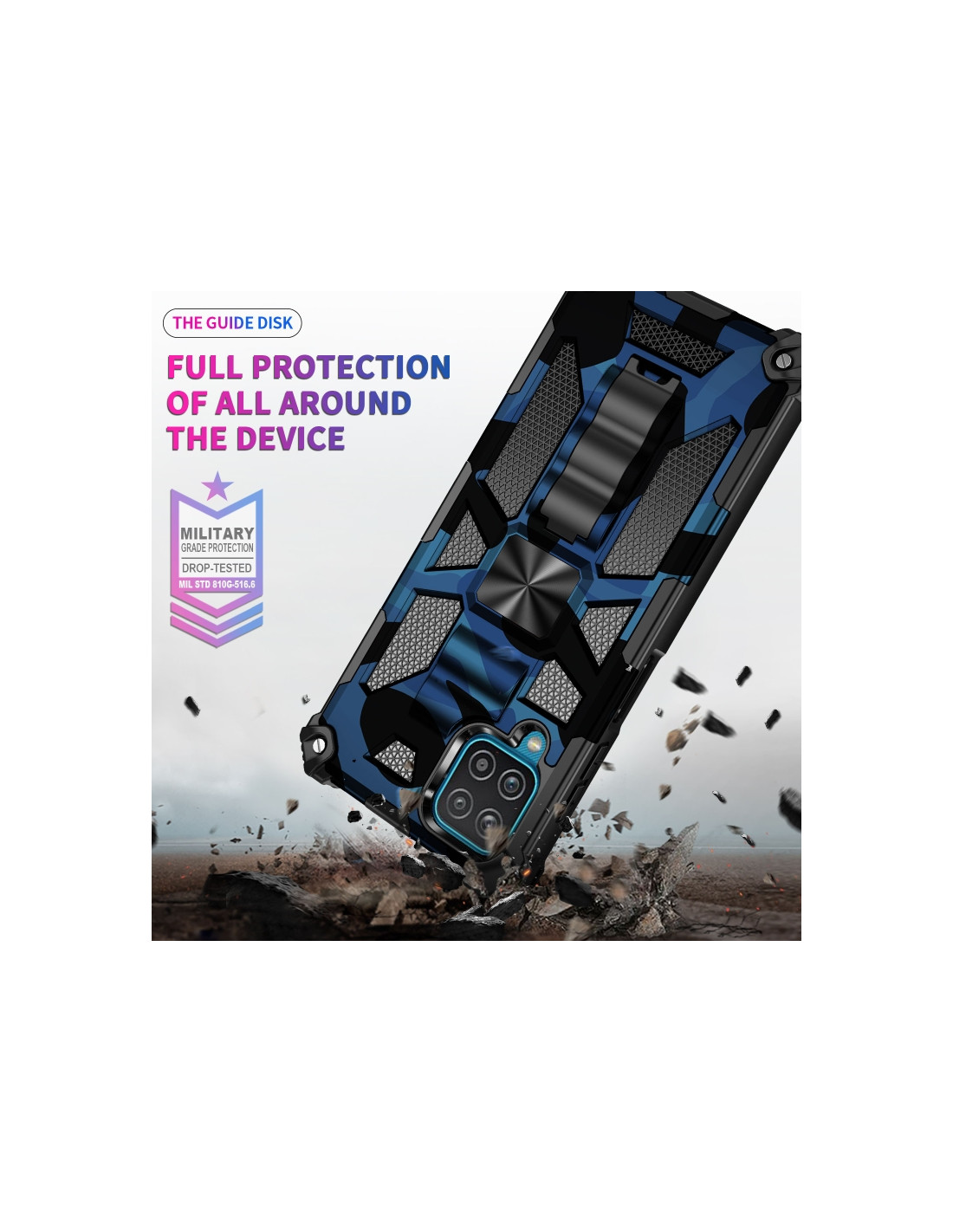 Cover antiurto Galaxy A12 in TPU + PC con design mimetico blu scuro e supporto magnetico integrato.