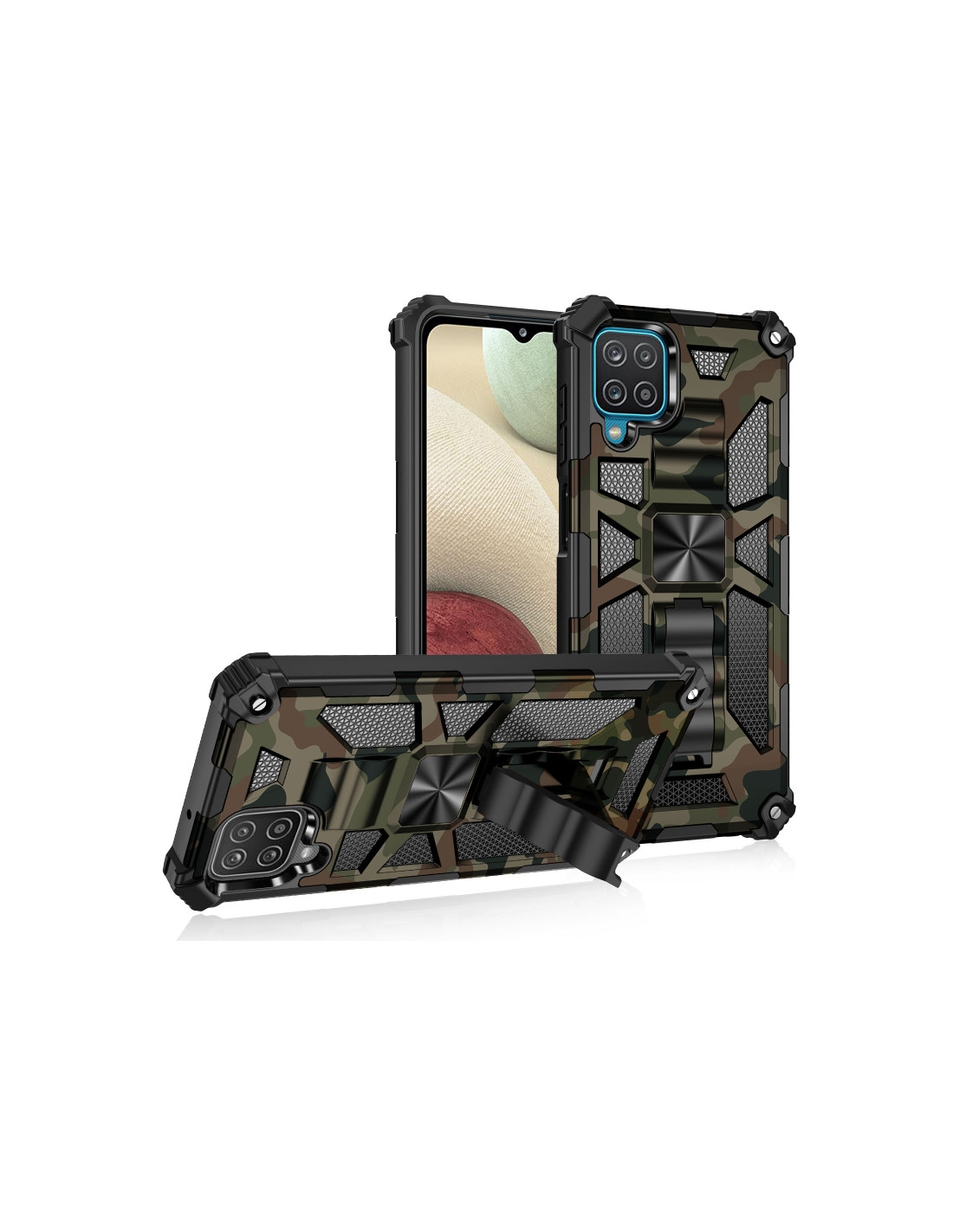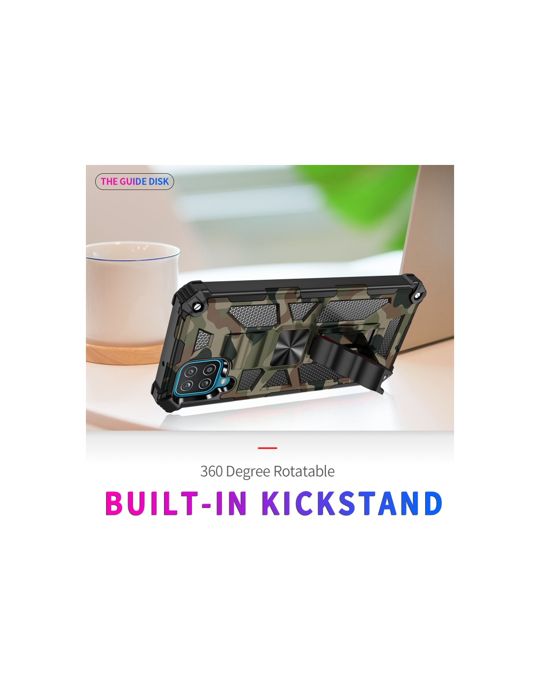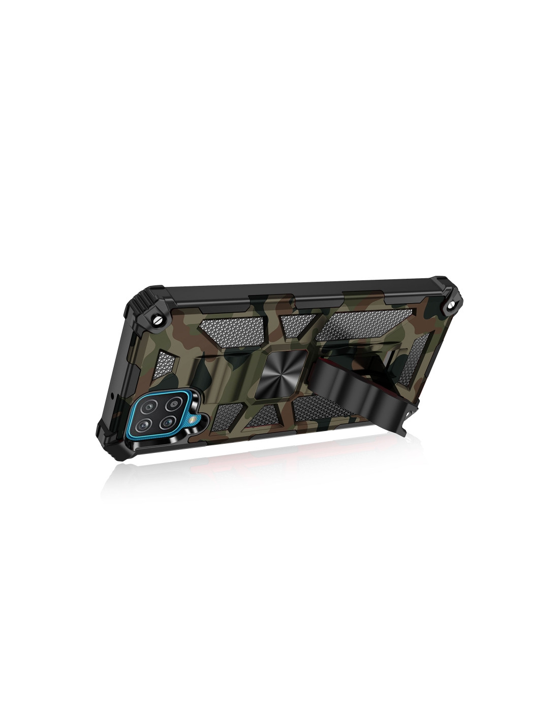 Cover antiurto Galaxy A22 4G in TPU + PC con design mimetico e supporto magnetico integrato.