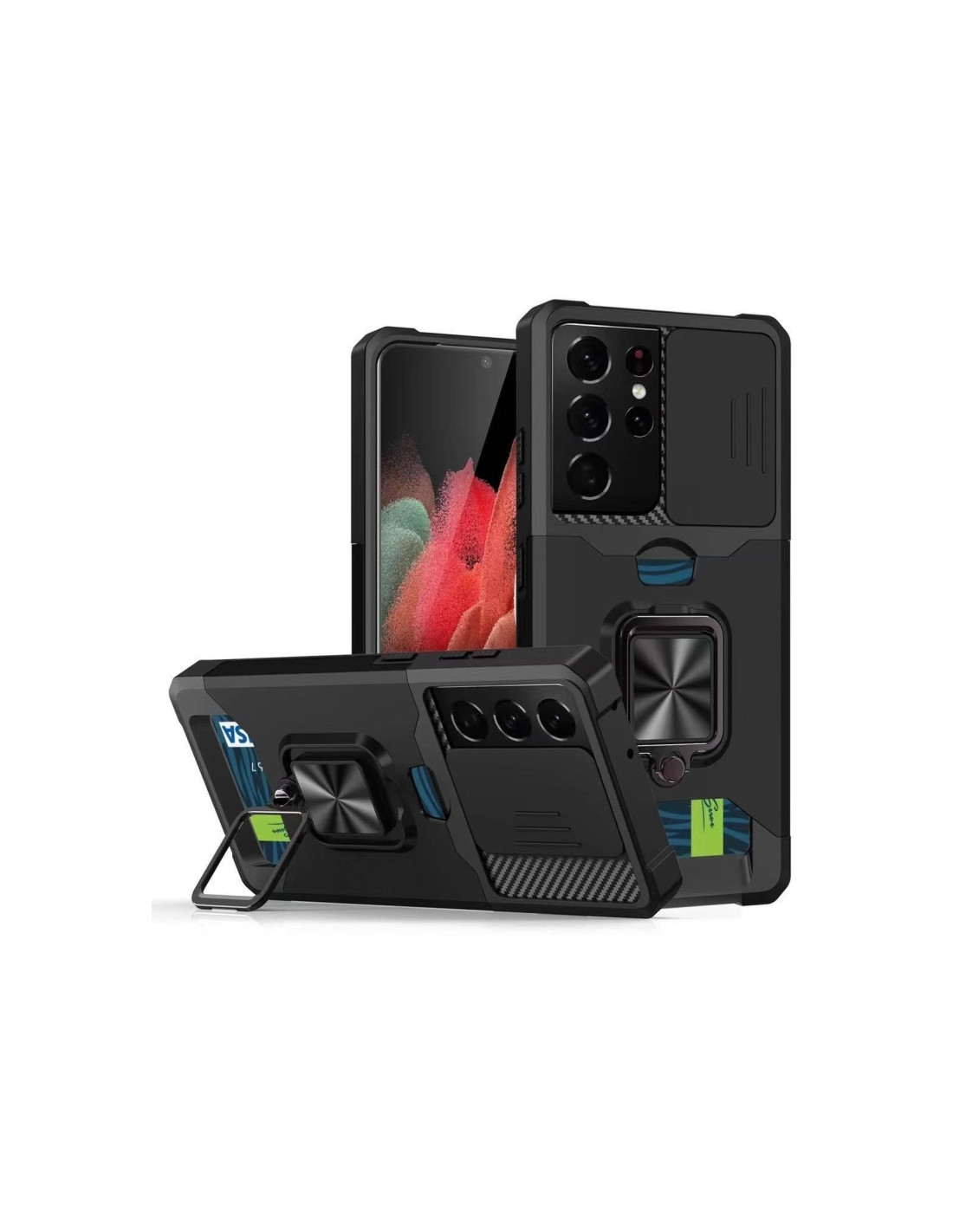 Cover antiurto Galaxy S21 Ultra in PC + TPU con sliding camera cover, anello e slot per carte.