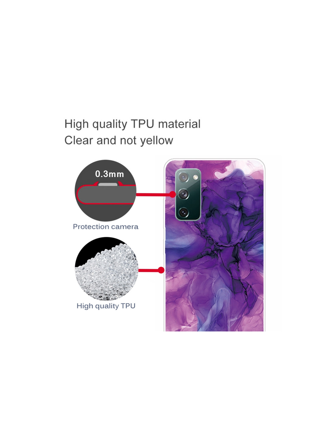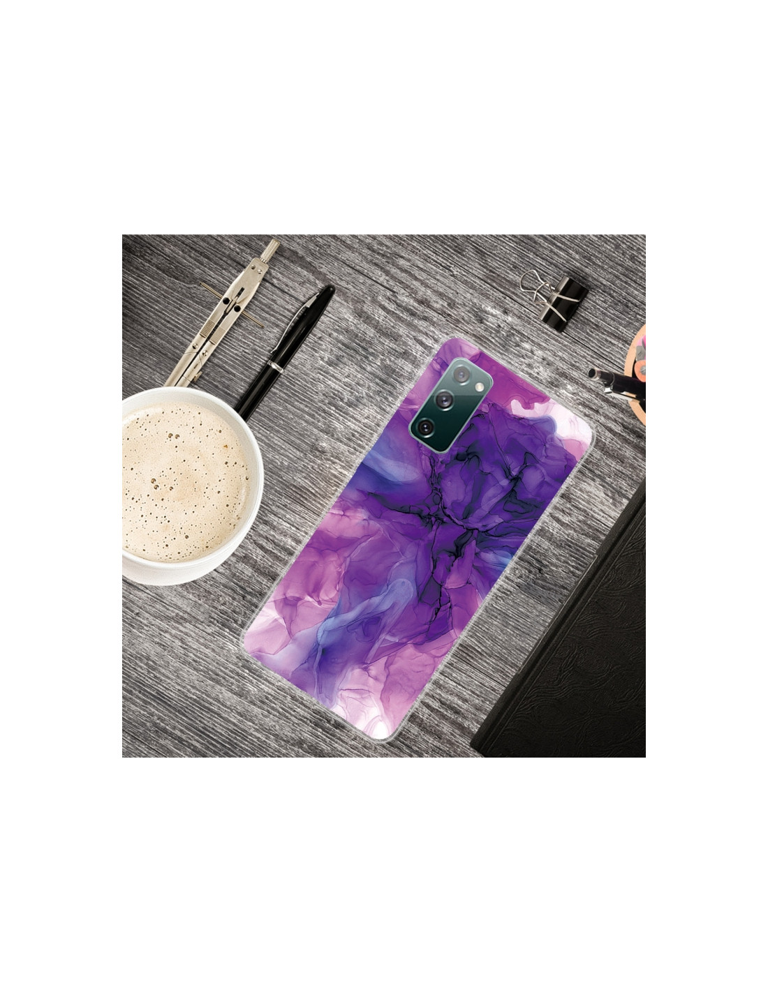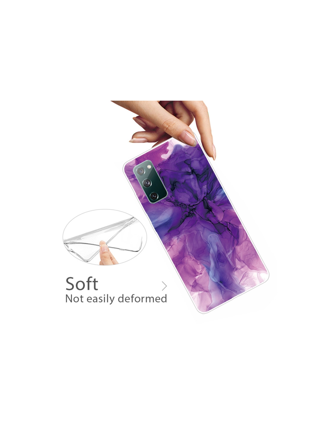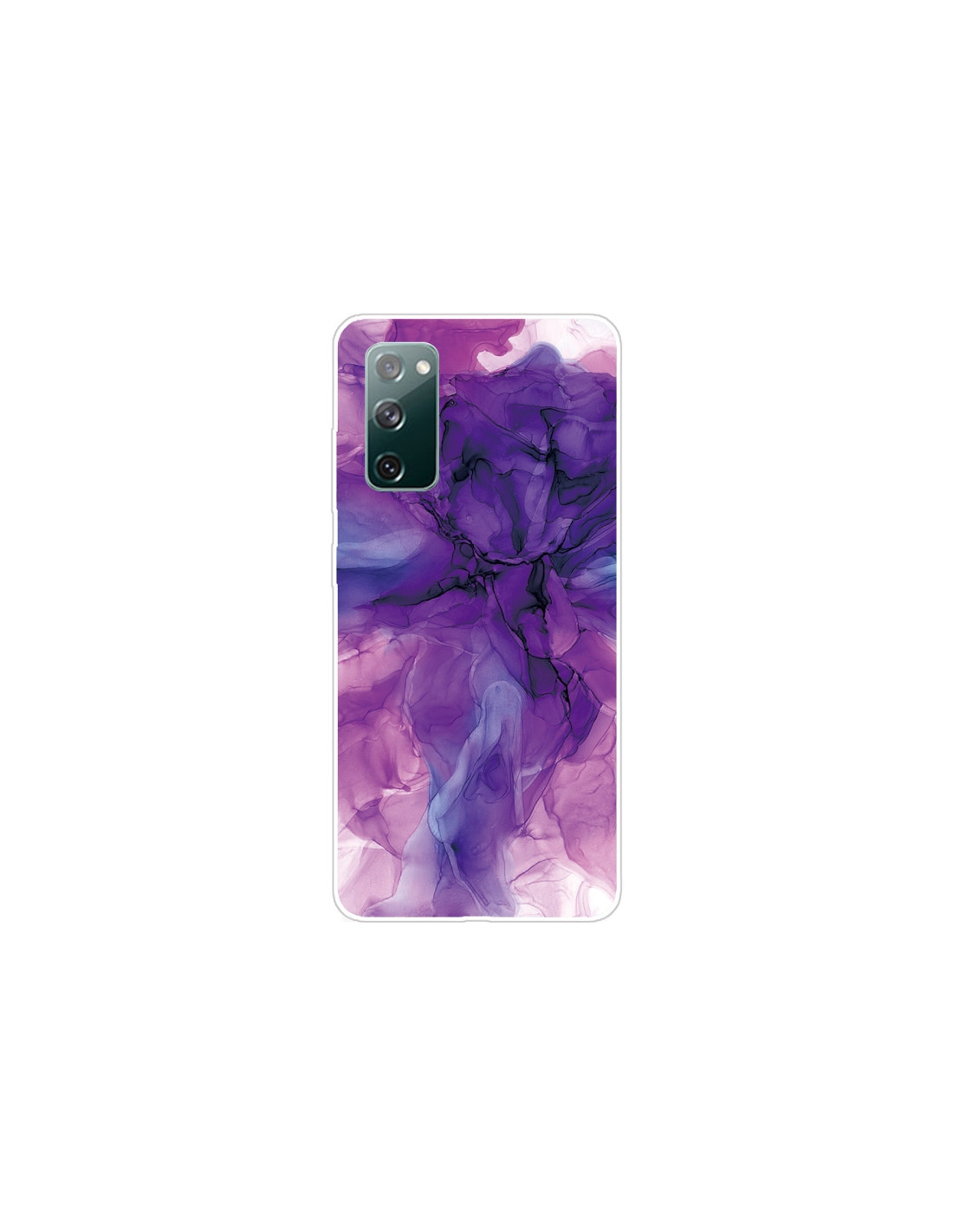 Cover antiurto Galaxy S20 FE in TPU con design marmo astratto viola. Protezione totale e stile elegante.