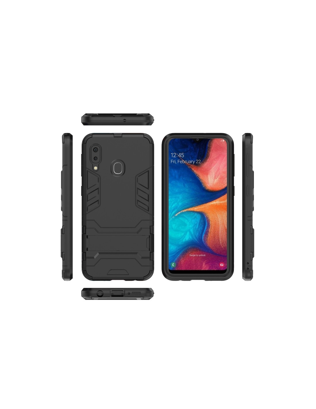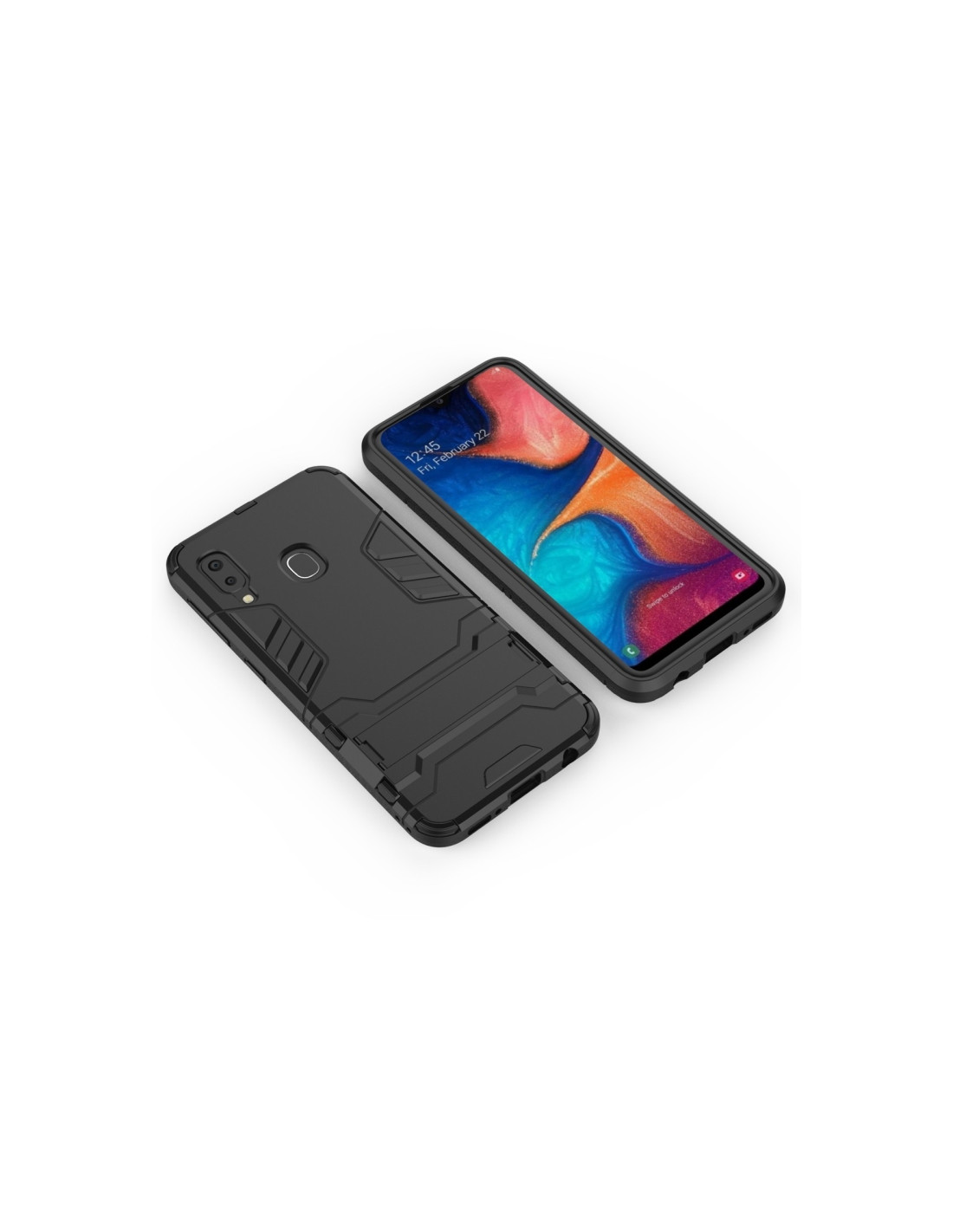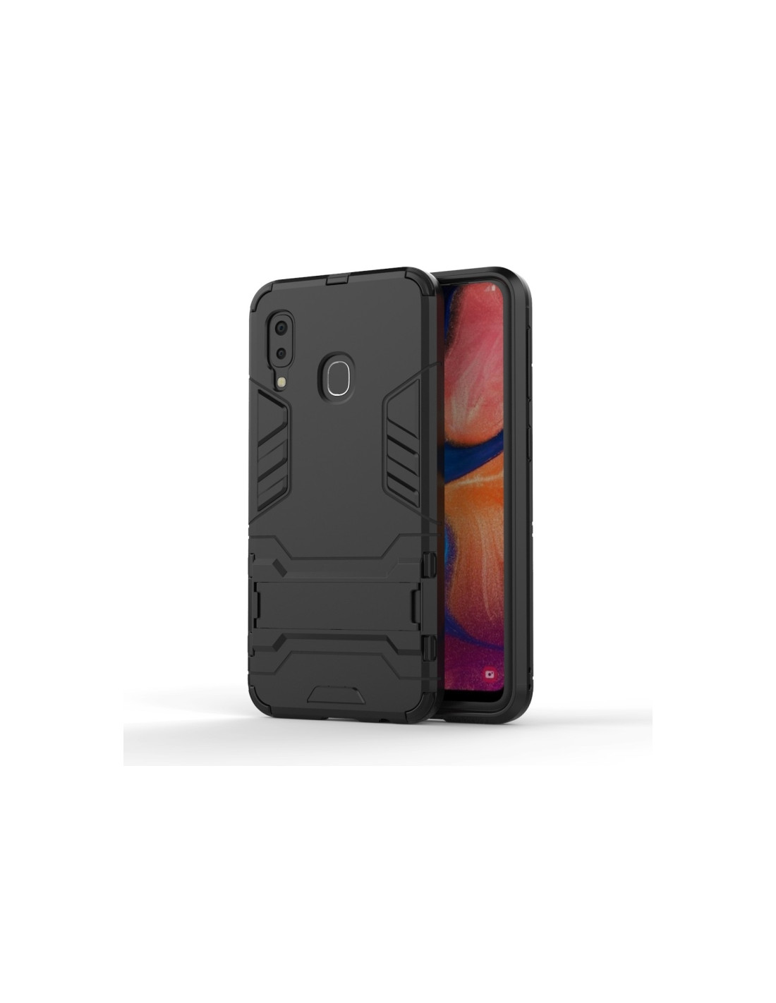 Cover antiurto per Galaxy A20e in PC + TPU nero con supporto integrato. Protezione robusta e design compatto.