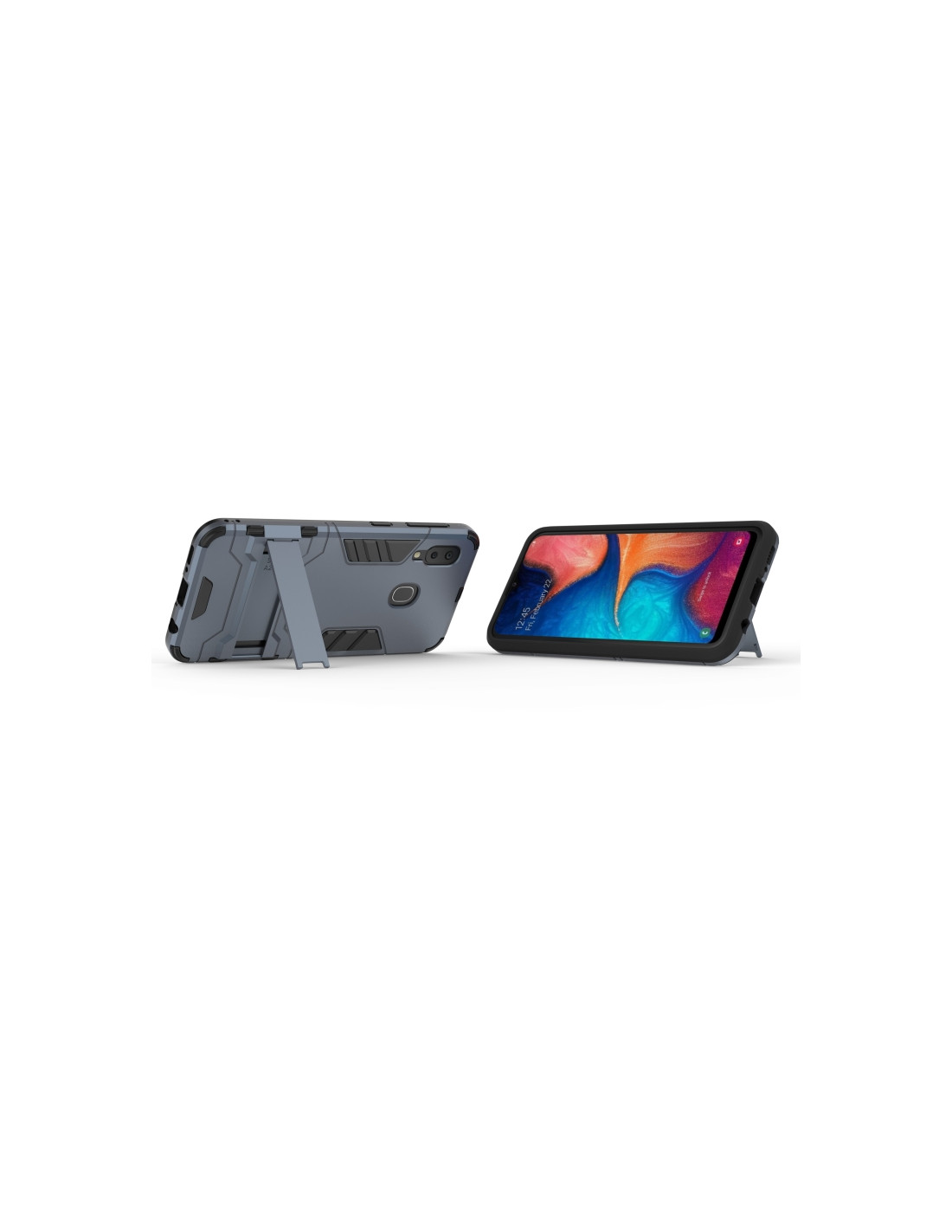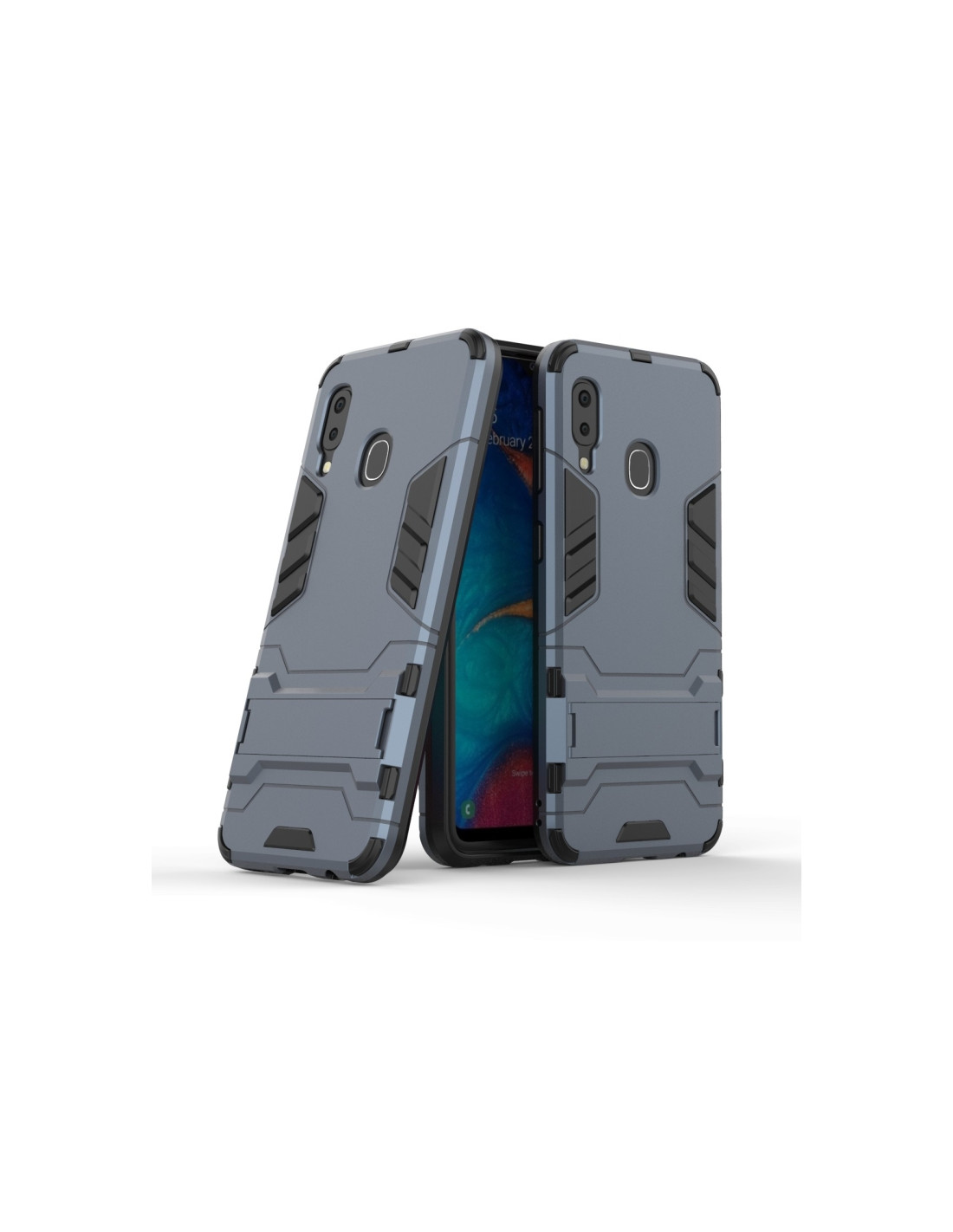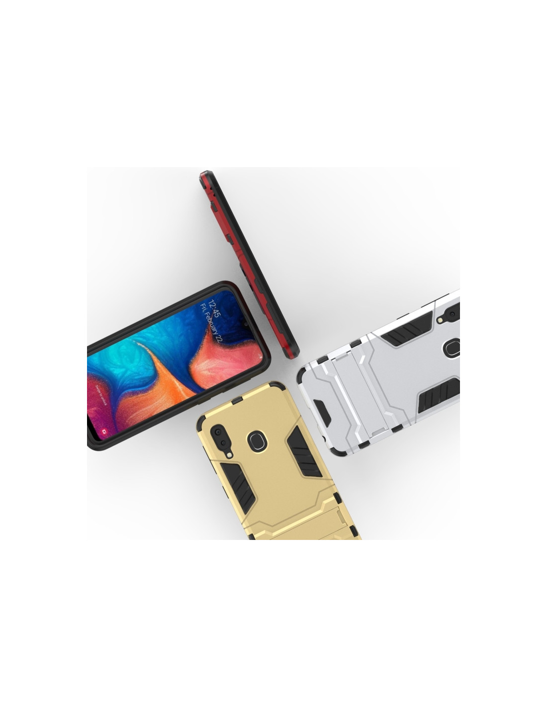 Cover antiurto per Galaxy A20e in PC + TPU nero con supporto integrato. Protezione robusta e design compatto.