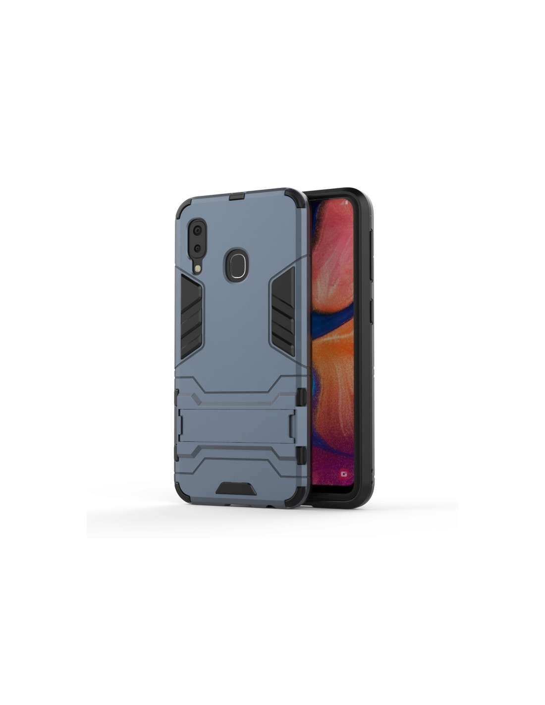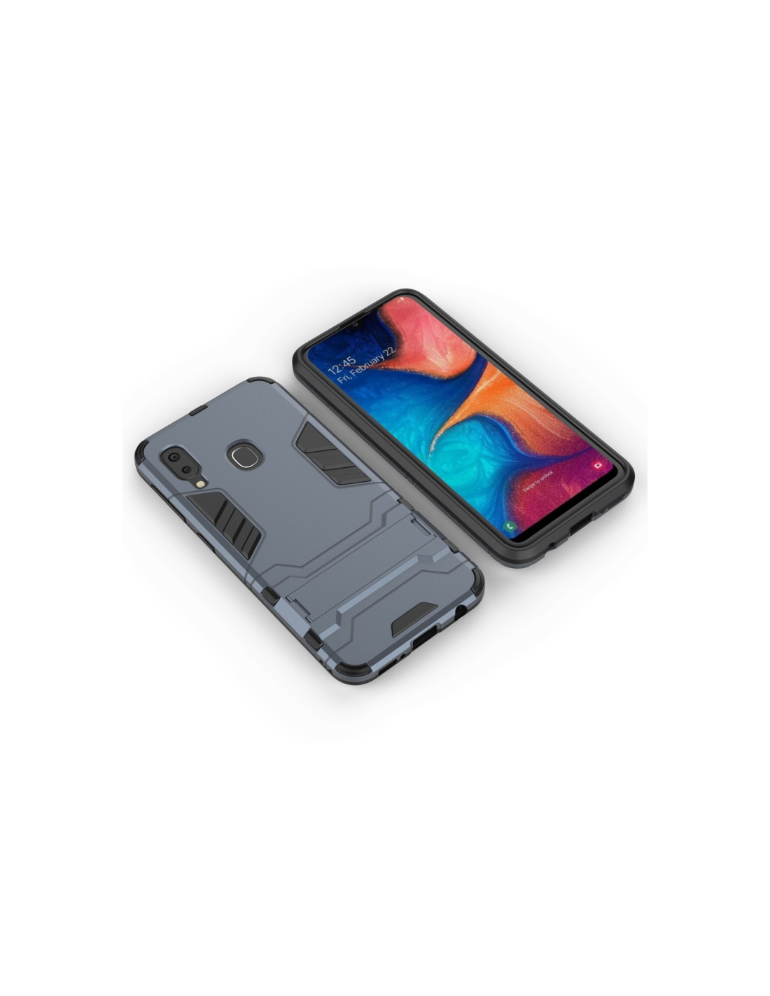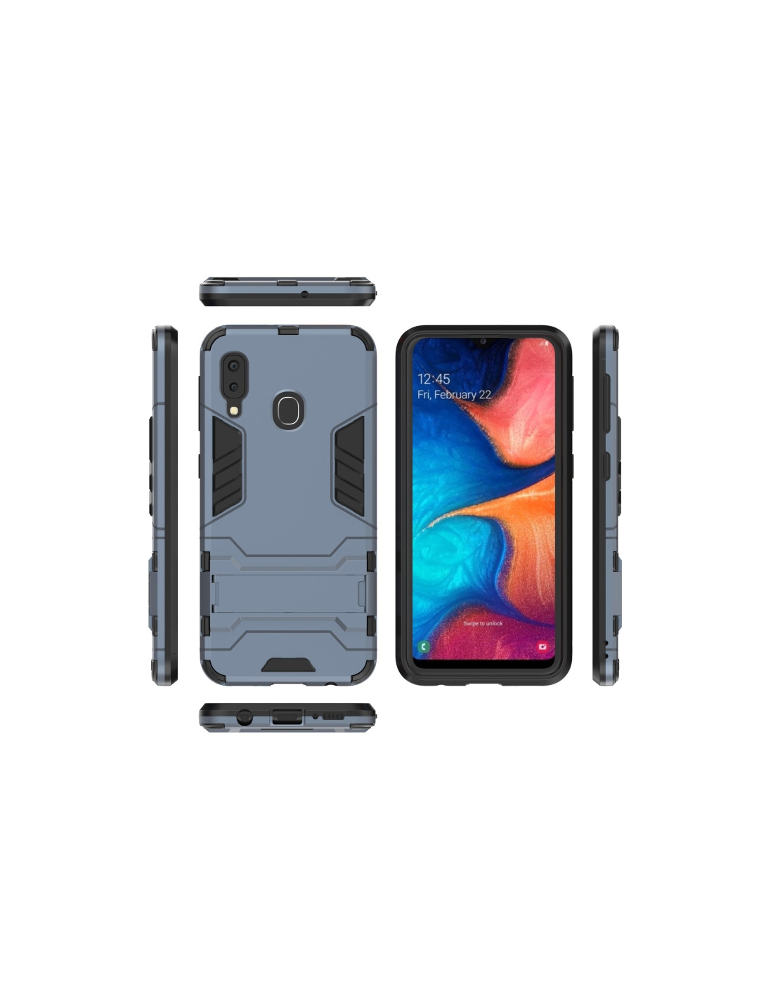 Cover antiurto per Galaxy A20e in PC + TPU nero con supporto integrato. Protezione robusta e design compatto.