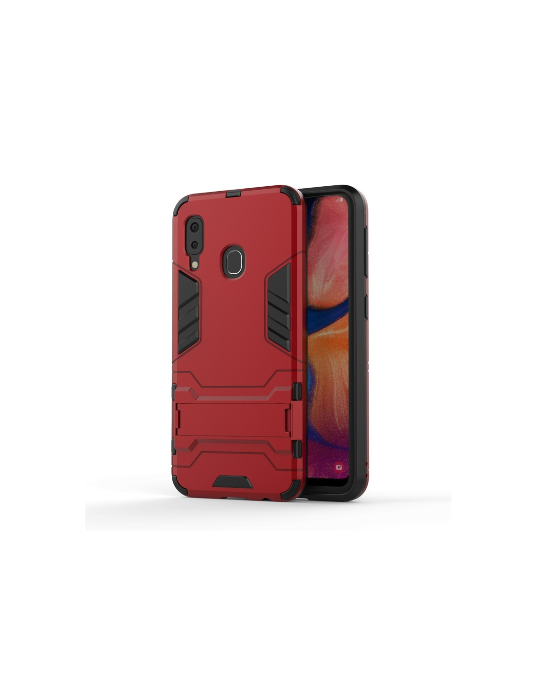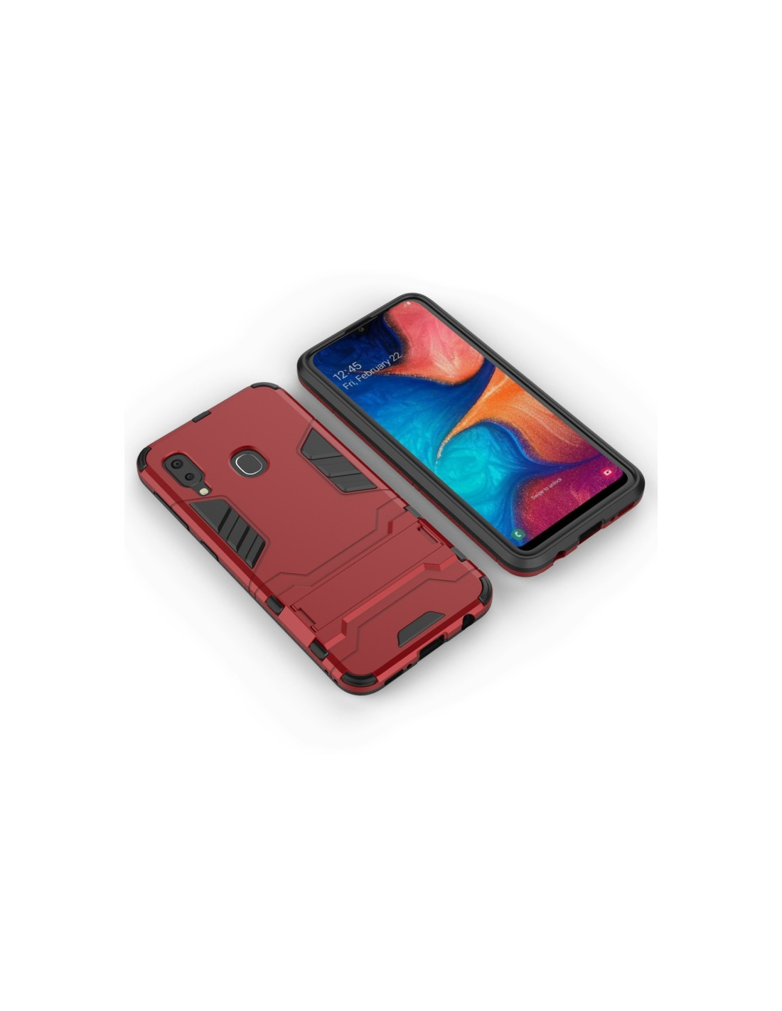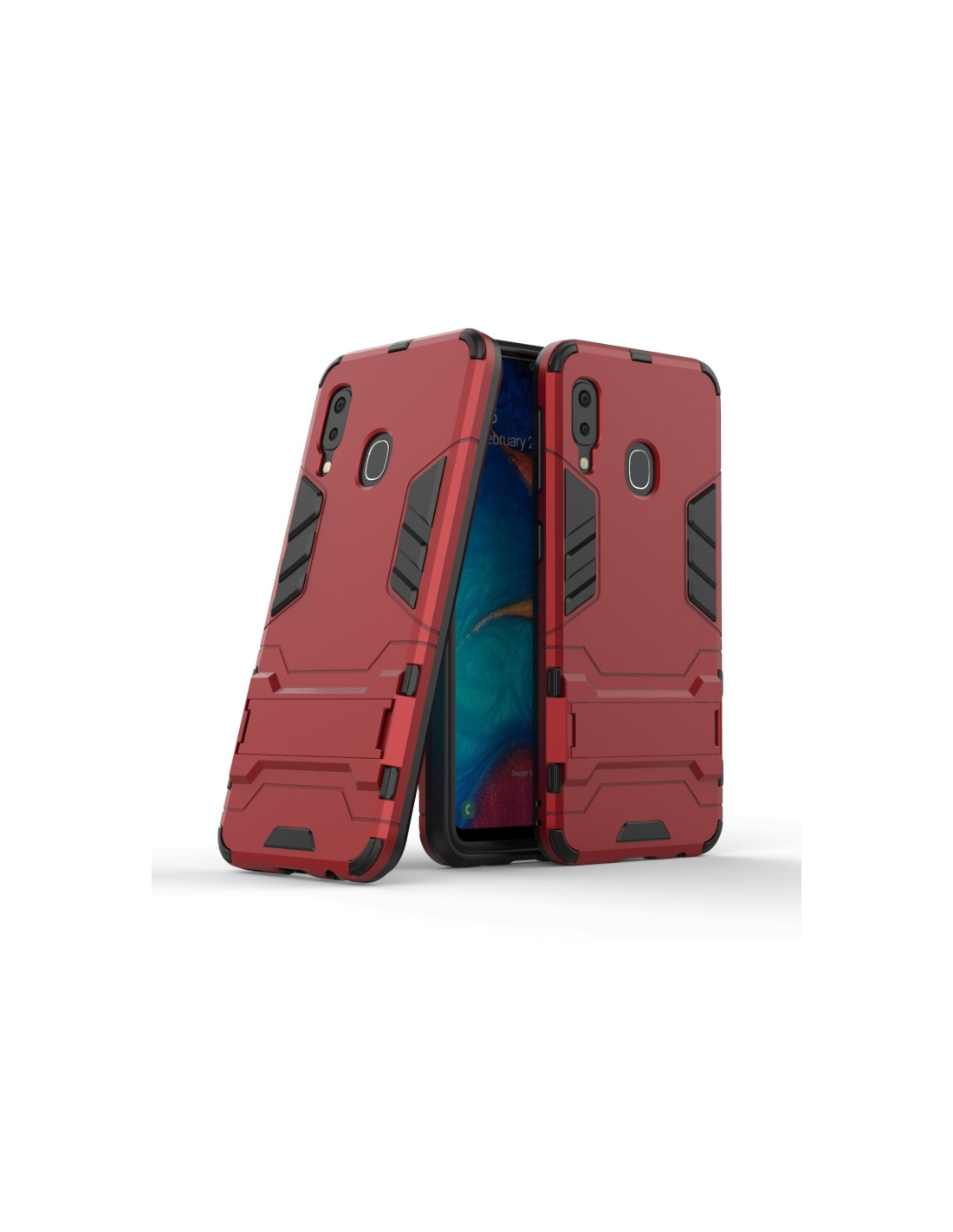Cover antiurto per Galaxy A20e in PC + TPU nero con supporto integrato. Protezione robusta e design compatto.