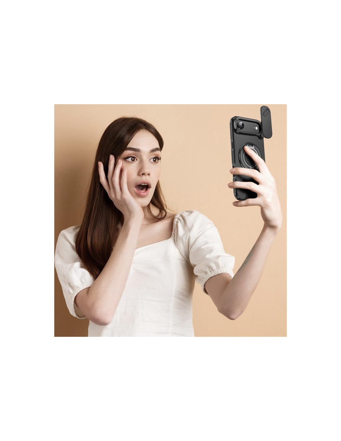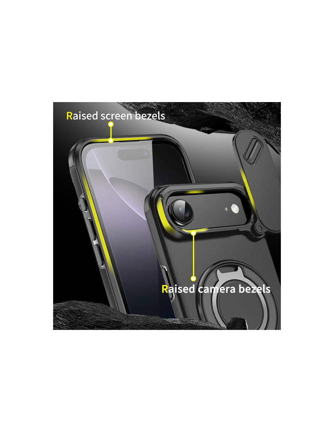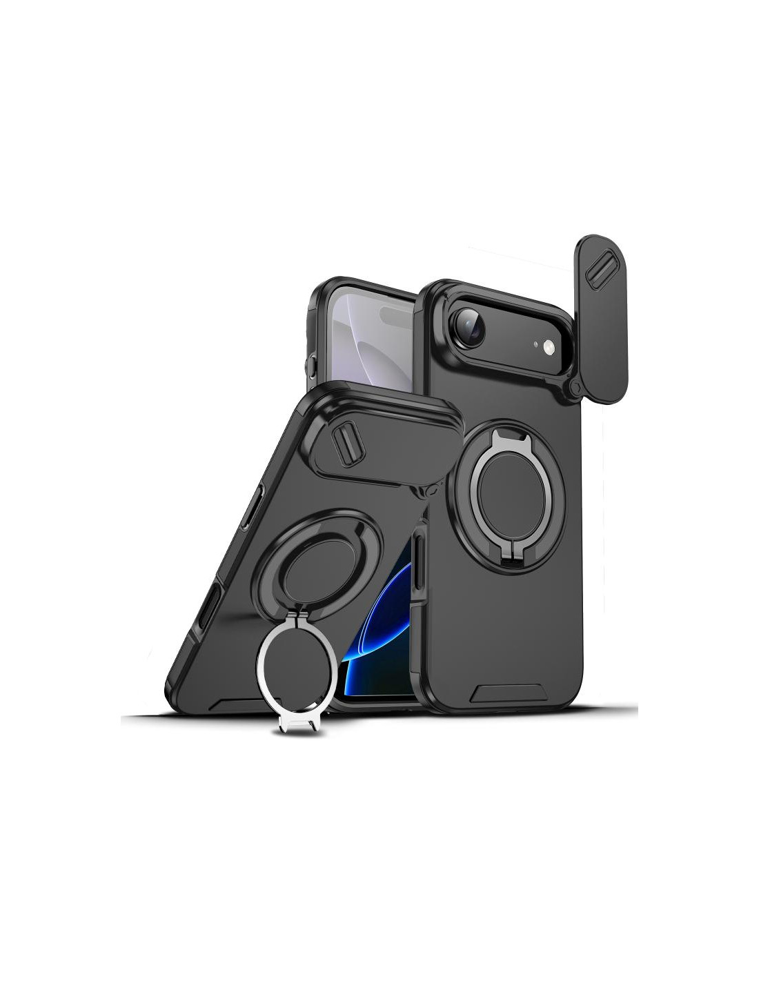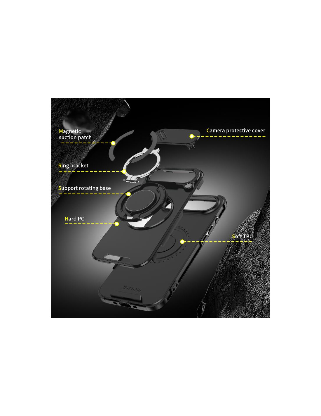 Cover iPhone Air con design mimetico, ring holder e protezione PC + TPU per una presa sicura.