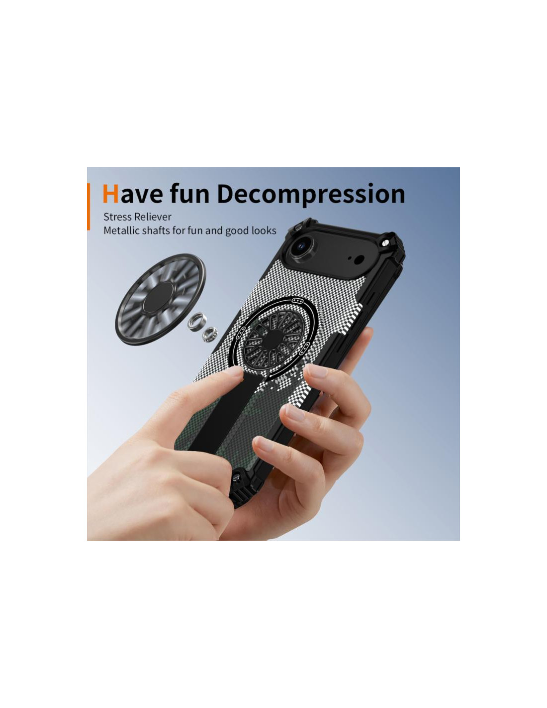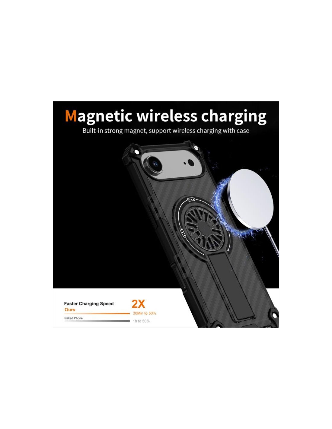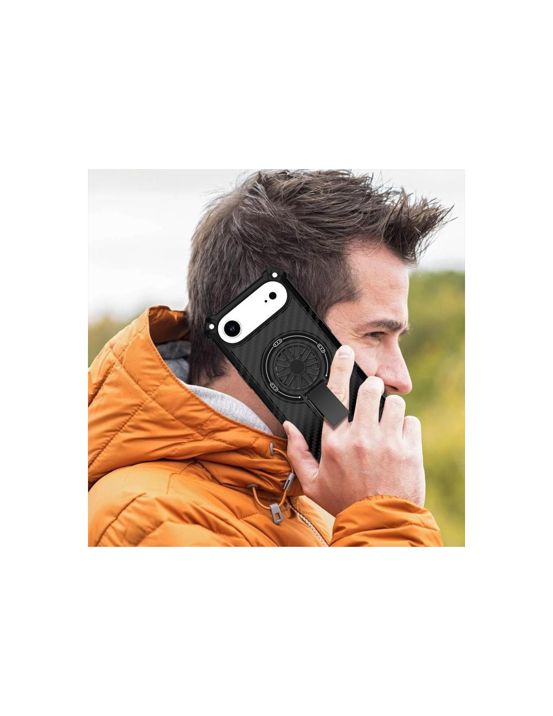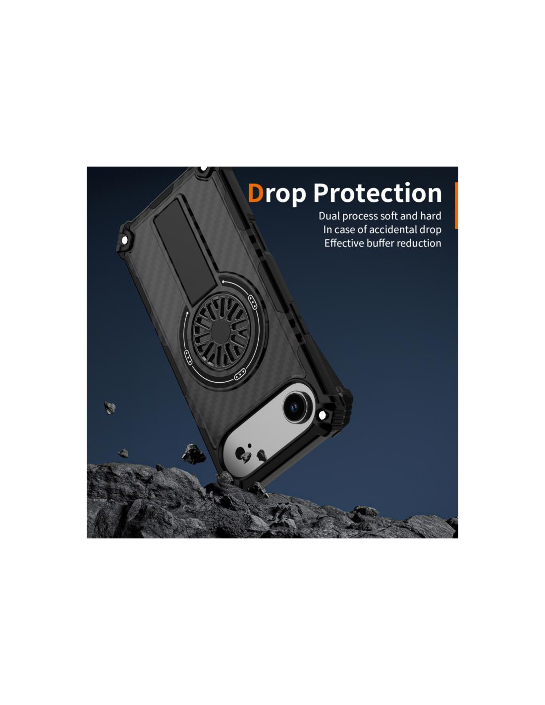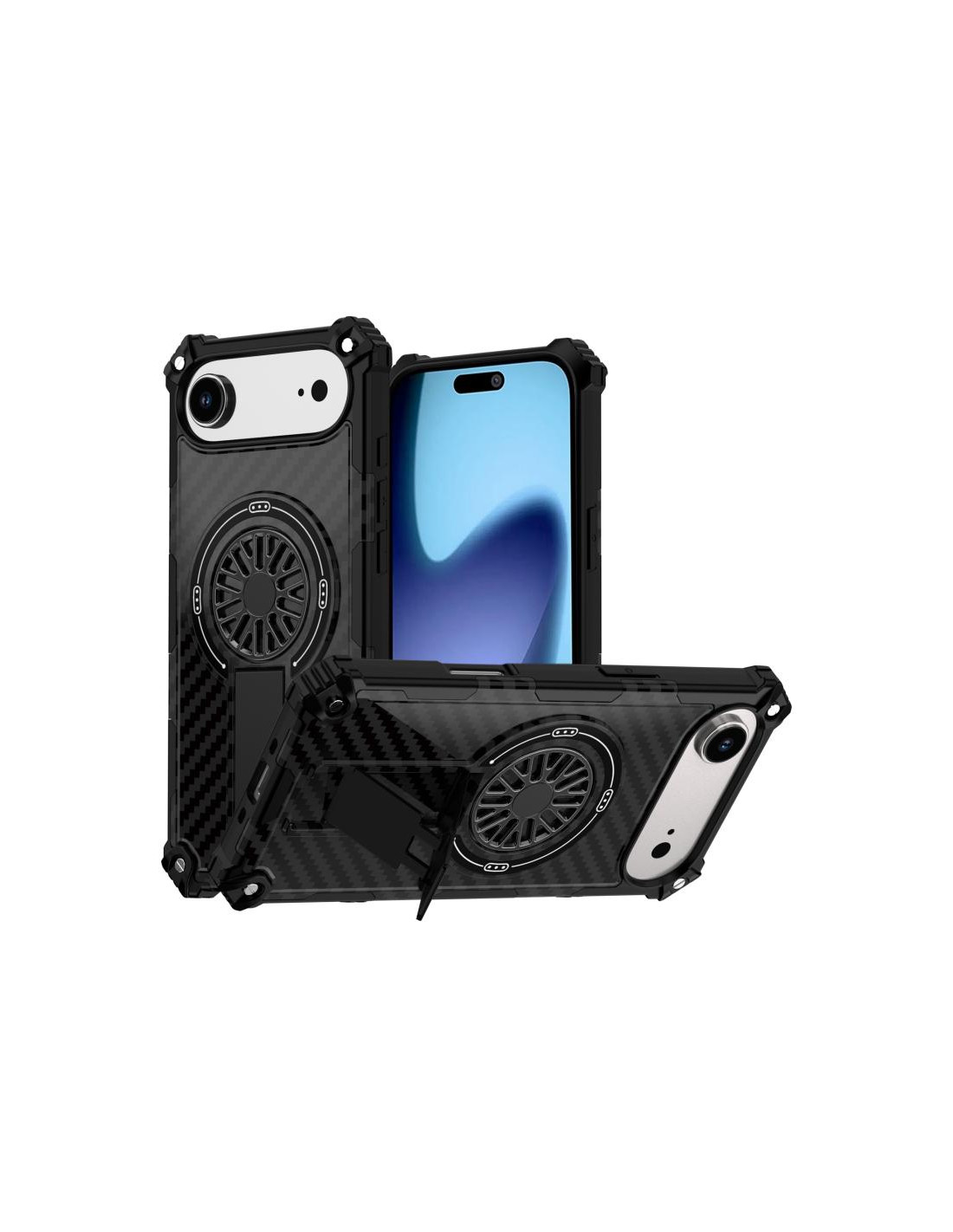 Cover iPhone Air mimetica con supporto rotante MagSafe. Protezione e stile in fibra di carbonio nero.