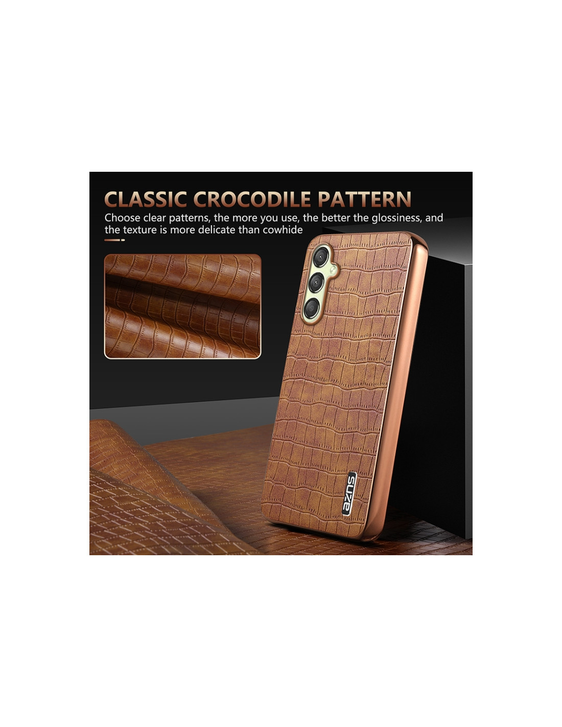 Cover Galaxy A15 in TPU con texture coccodrillo e frame cromato. Protezione completa e design elegante.