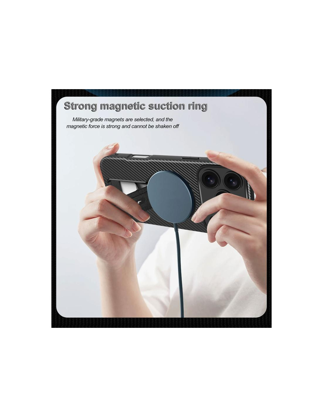 Cover per iPhone 17 Pro Max con texture fibra di carbonio e supporto MagSafe integrato. Protezione e stile in nero.